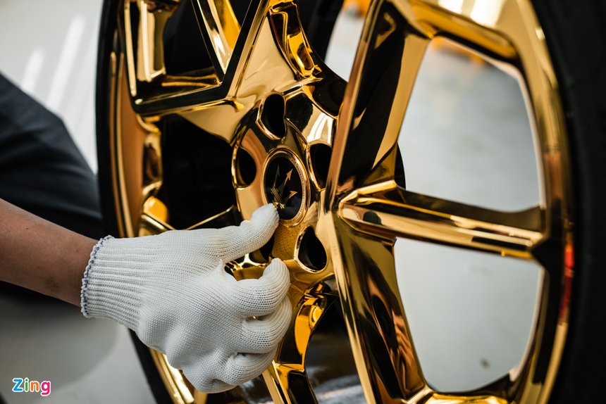 Đội ngũ chế tác đã dùng nguyên liệu vàng 18K và 24K để ướm lên lớp áo cho những chi tiết trên xe. Bộ mâm nguyên bản được tẩy sơn, xử lý nền, đánh bóng và mạ vàng 18K hoàn thiện. Riêng 4 bộ mâm này đã mất 320 giờ để hoàn thành. |