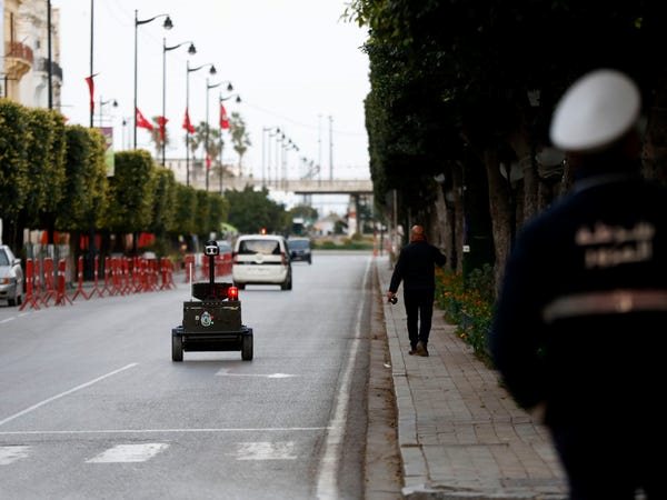 Cảnh sát Tunisia đã dùng robot để tuần tra và thực thi lệnh phong tỏa trong đại dịch. Trên khắp thế giới, robot được sử dụng để giảm thiểu sự lây lan của Covid-19, căn bệnh do virus SARS-CoV-2 gây ra, bằng cách thay thế con người làm những công việc như khử trùng, vận chuyển.