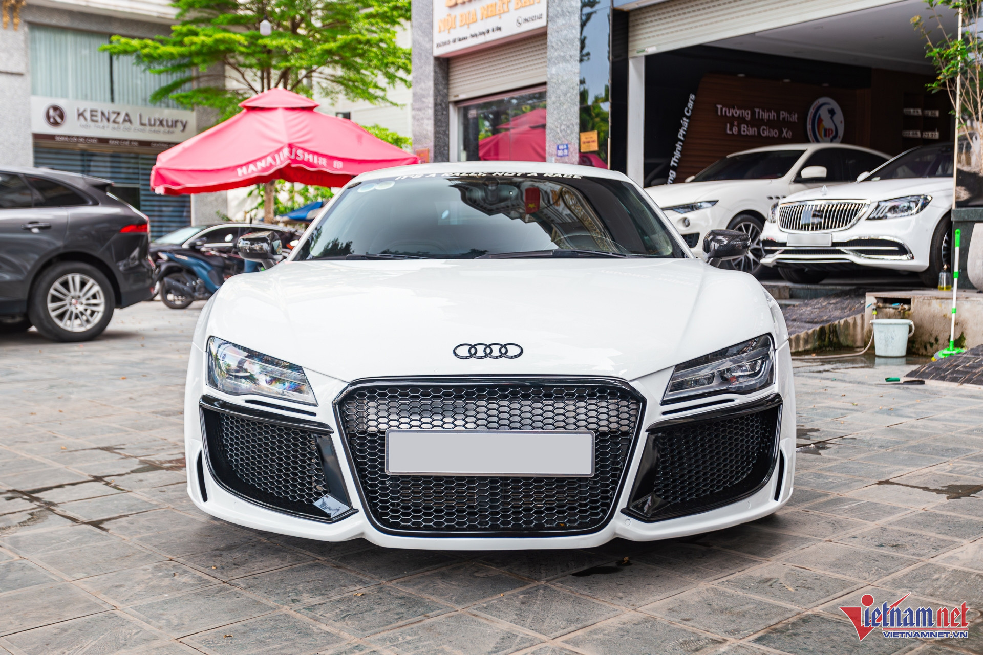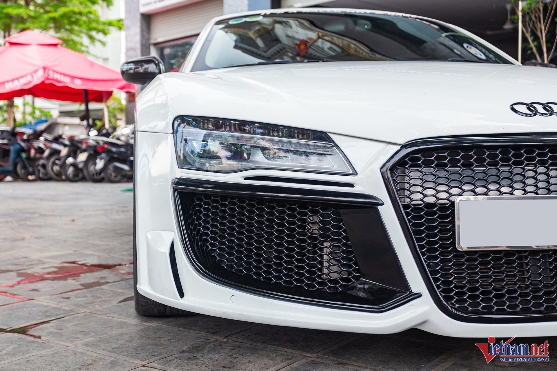 Về ngoại thất, chiếc siêu xe này đặc biệt hơn khi được chủ nhân cũ nâng cấp gói độ Regula Tuning. Phần đầu xe hầm hố hơn với hốc gió và mặt ca-lăng lớn hơn. Cụm đèn chiếu sáng nguyên bản thay bằng đèn của mẫu R8 facelift đời 2012. Hai bên có khe hút gió nhỏ, kết hợp cùng ốp sườn thiết kế như đường hút gió để cải thiện tính khí động học.