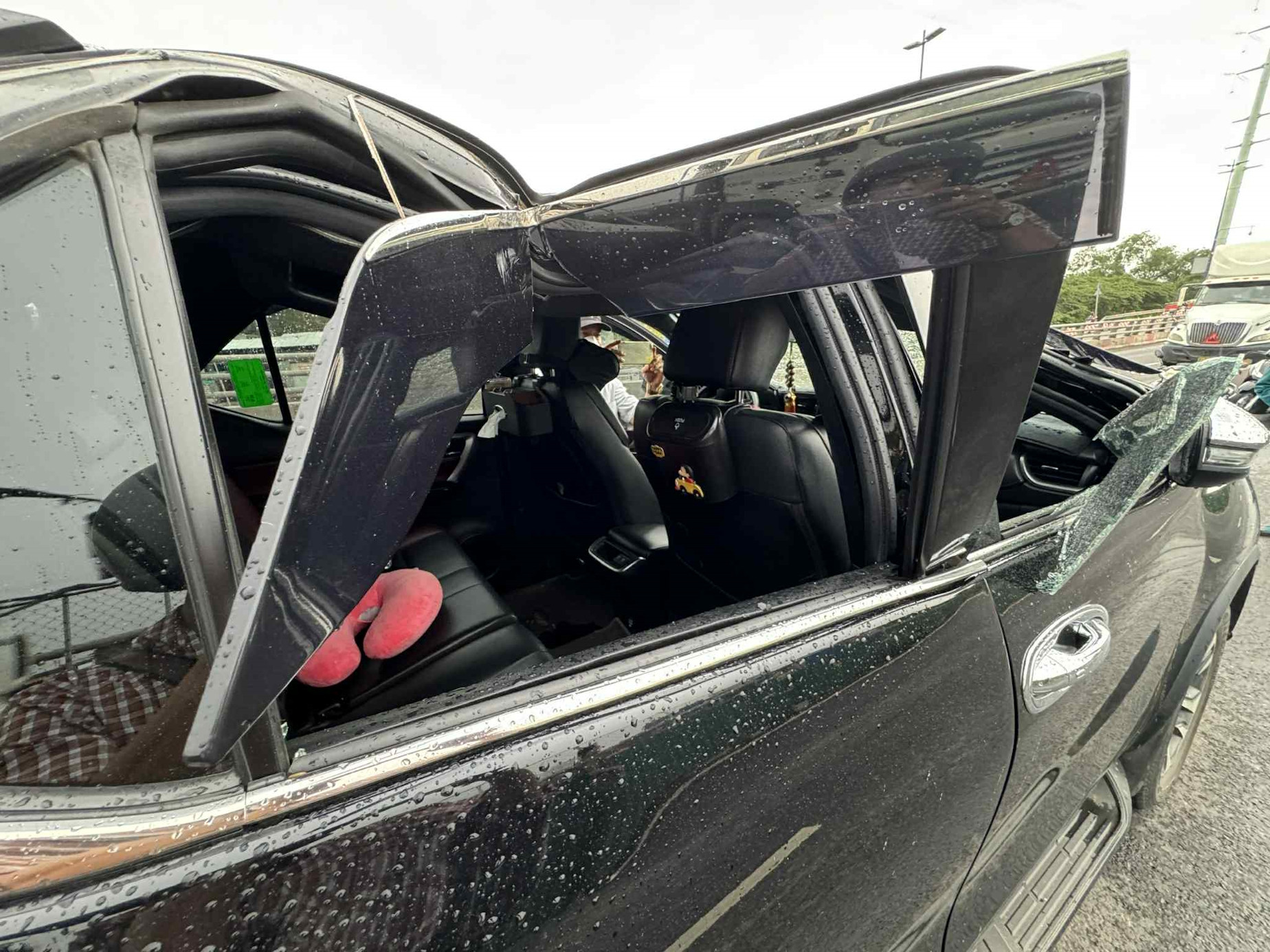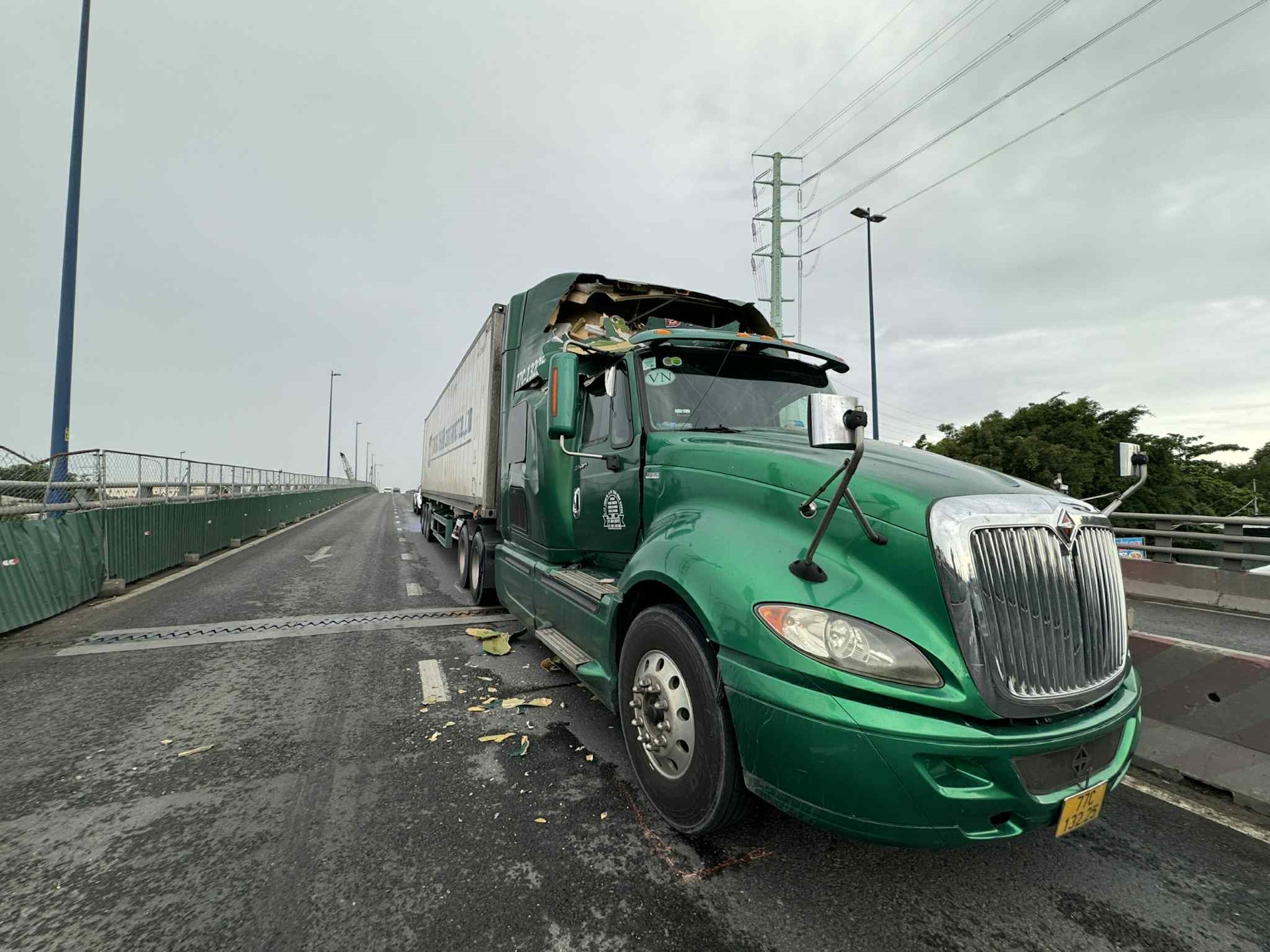 May mắn, sự cố không gây thương vong nhưng khiến tài xế, phụ xe container cùng nhiều người bên trong ô tô 7 chỗ một phen hoảng vía.