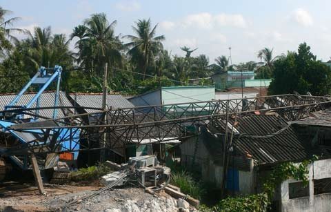 Chiếc cần cẩu dài khoảng hơn 20m đã đổ vào 3 căn nhà nằm sát cầu Cái Vồn.
