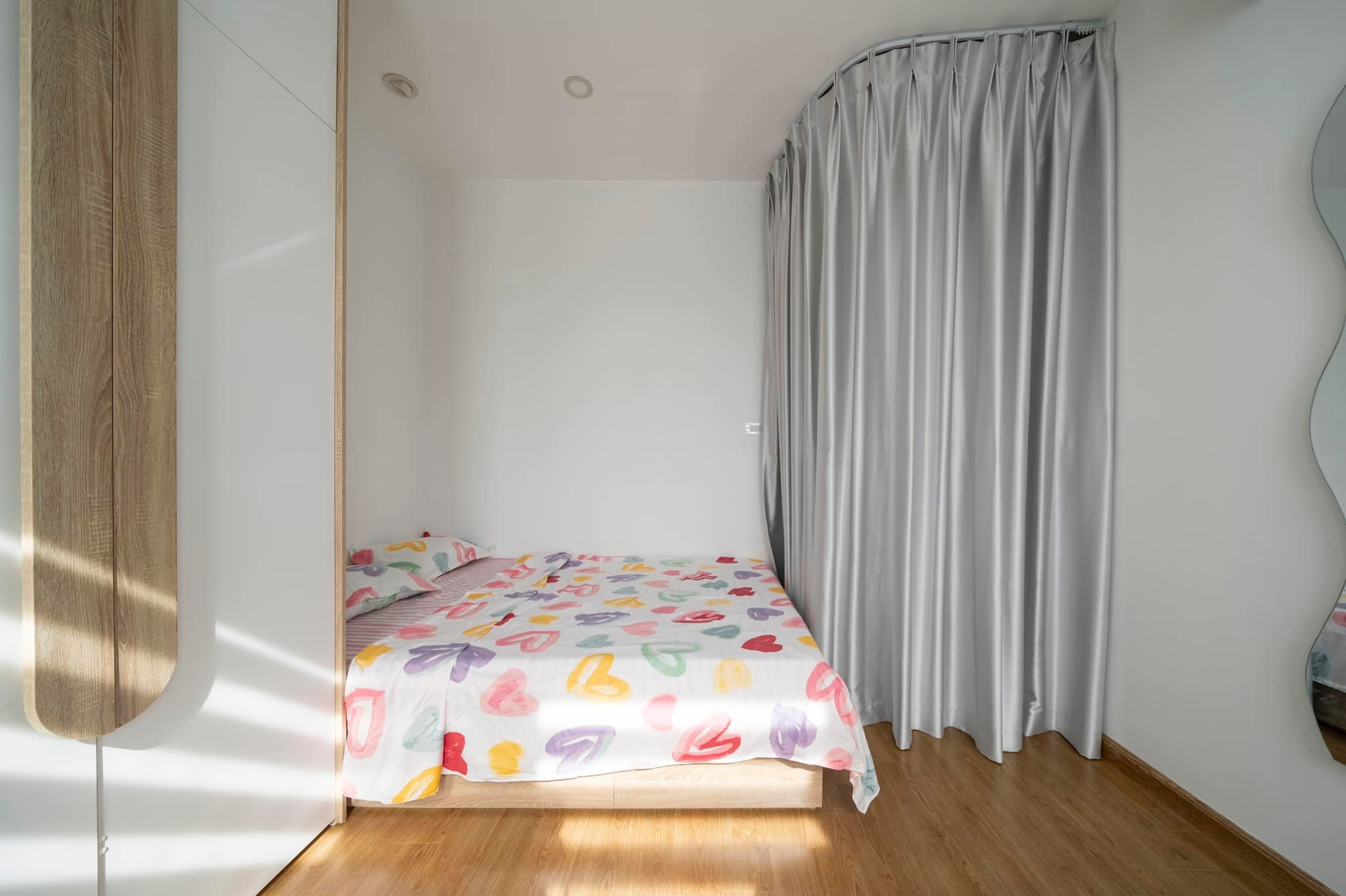 Phòng ngủ của bé gái. Vì căn phòng có tới 3 hệ cửa nhìn ra bên ngoài mà bé gái mỗi lần muốn thay đồ kéo rèm cầu vồng bất tiện nên chị Phương Bùi bố trí như vậy, tạo thành khoang thay đồ lưu động.