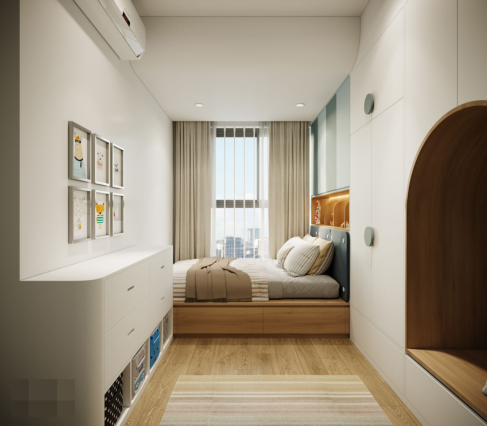 Diện tích bé nên giường đẩy sát cửa sổ, chừa không gian cho hệ tủ và khu vực chơi. Chiếc kệ tam giác tận dụng tối đa góc chết, tăng nơi lưu trữ đồ.