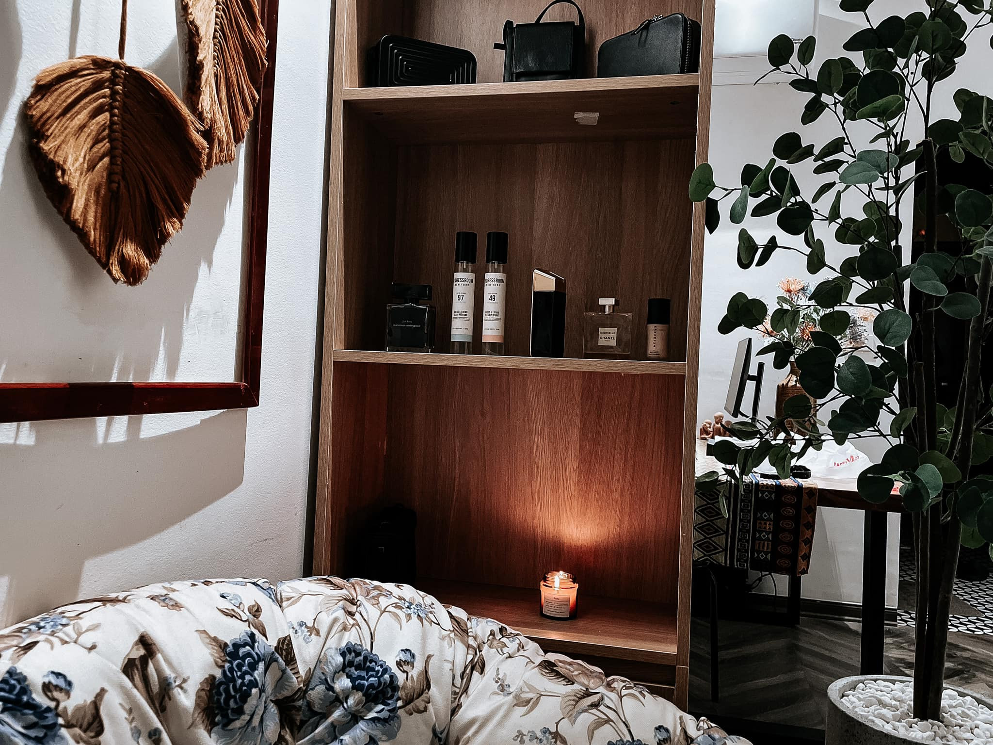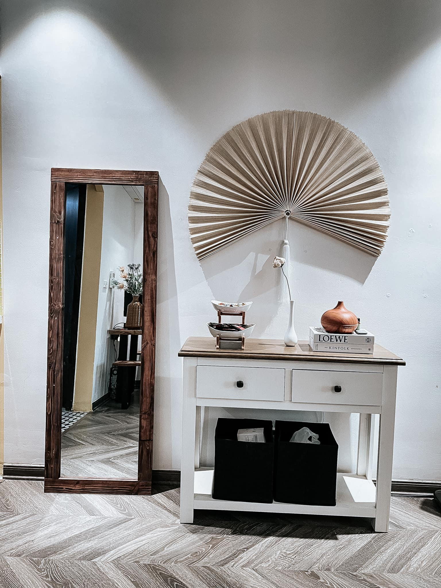 Gương soi màu gỗ óc chó tinh tế, chiếc quạt treo tường độc đáo... tạo thành góc đẹp mắt, có thể sống ảo được.