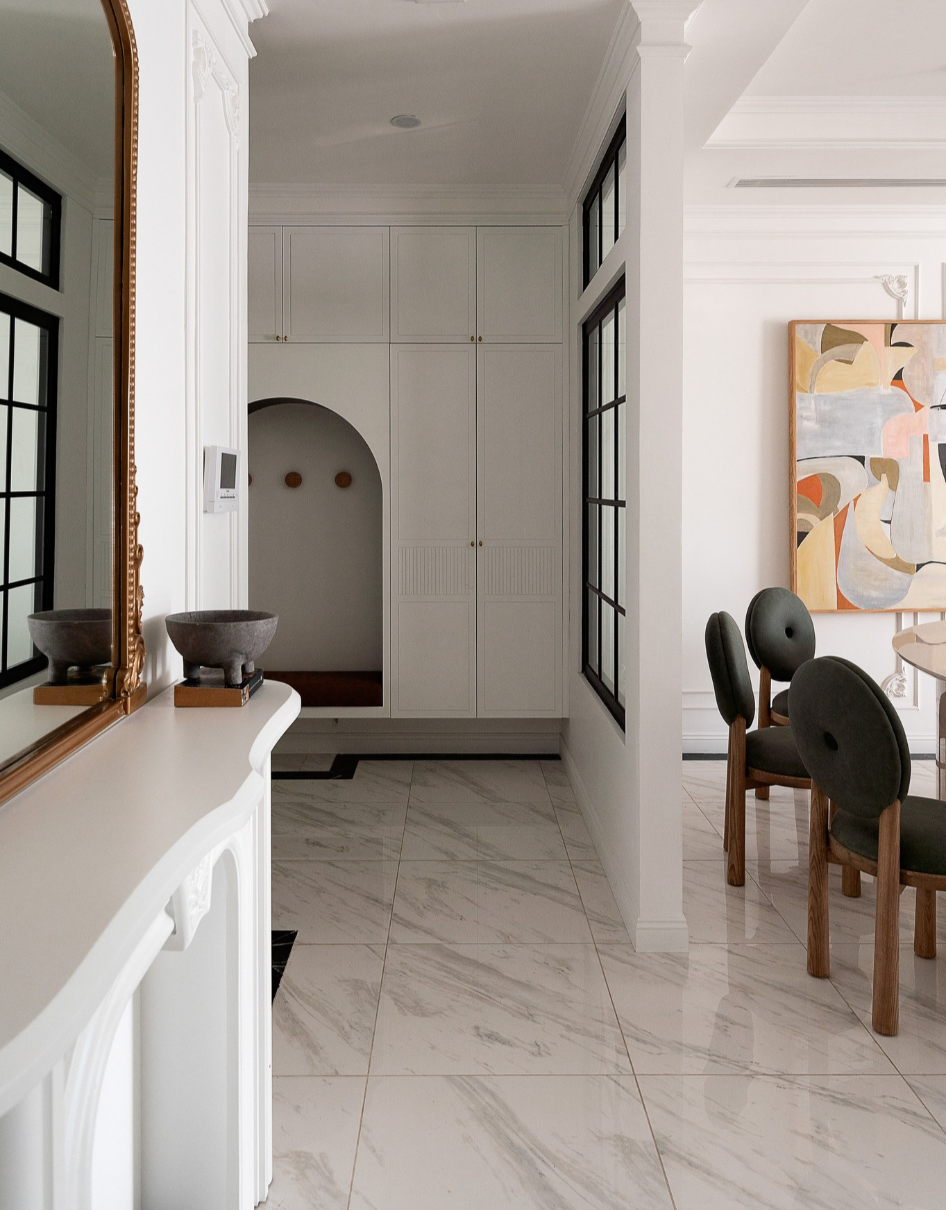 Để phong cách này không bị “loãng”, nhóm thiết kế kết hợp phong cách này với phong cách cổ điển, vừa giúp không gian trở nên sang trọng và độc đáo. Với ưu điểm diện tích rộng nên nhóm đặt một tủ giầy lớn kèm ghế ngồi đi giầy, giúp gia chủ thuận tiện trong qua trình sử dụng.