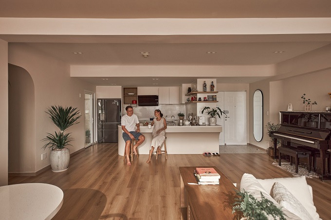 Căn hộ 2 phòng ngủ được thiết kế với tone màu sáng kết hợp gam màu nóng, tận dụng lại một số đồ nội thất có sẵn là đồ kỷ niệm của gia đình như cách giữ lại những ký ức tươi đẹp đã qua.
