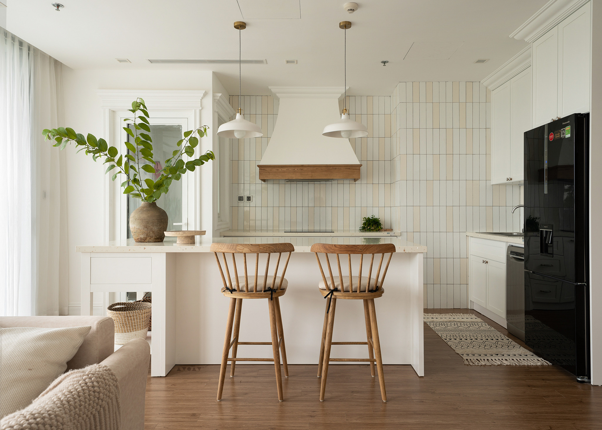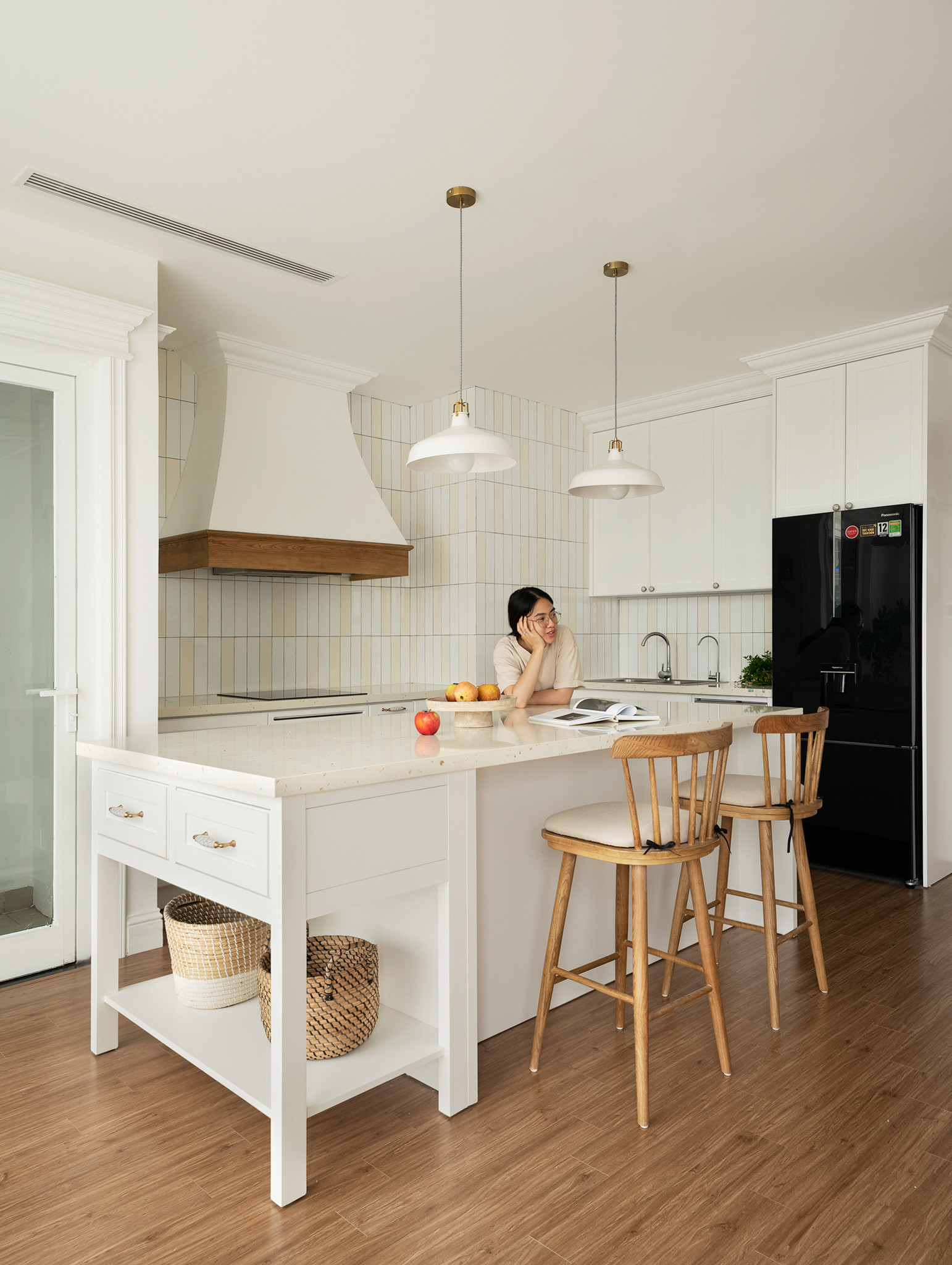 Khu bếp trắng sáng, lãng mạn. Anh Hiếu tư vấn, việc chọn sàn gỗ màu sắc ra sao phụ thuộc khá nhiều vào diện tích hiện có của căn hộ. Nếu căn hộ rộng, gia chủ có thể chọn màu sàn tông ấm. Nếu nhà chật thì sàn tông sáng sẽ giúp nhà trông rộng rãi hơn.