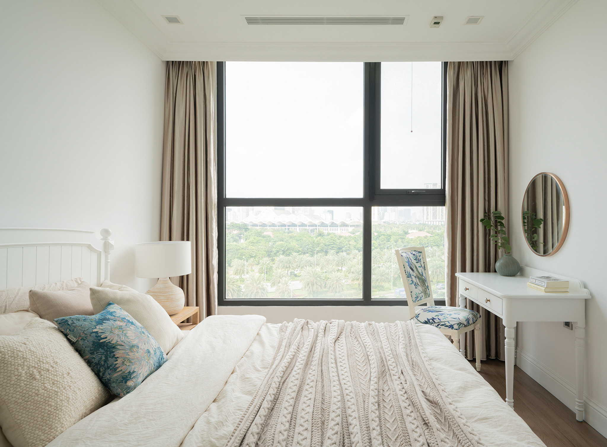Nhóm cũng sử dụng những chiếc đèn chiếu sáng tạo không gian gọn gàng, thoáng mát nhất có thể. Rèm cửa màu nhạt được sử dụng giúp không gian sáng hơn. Màu trắng là một lựa chọn khá an toàn khi thiết kế phòng ngủ theo phong cách này