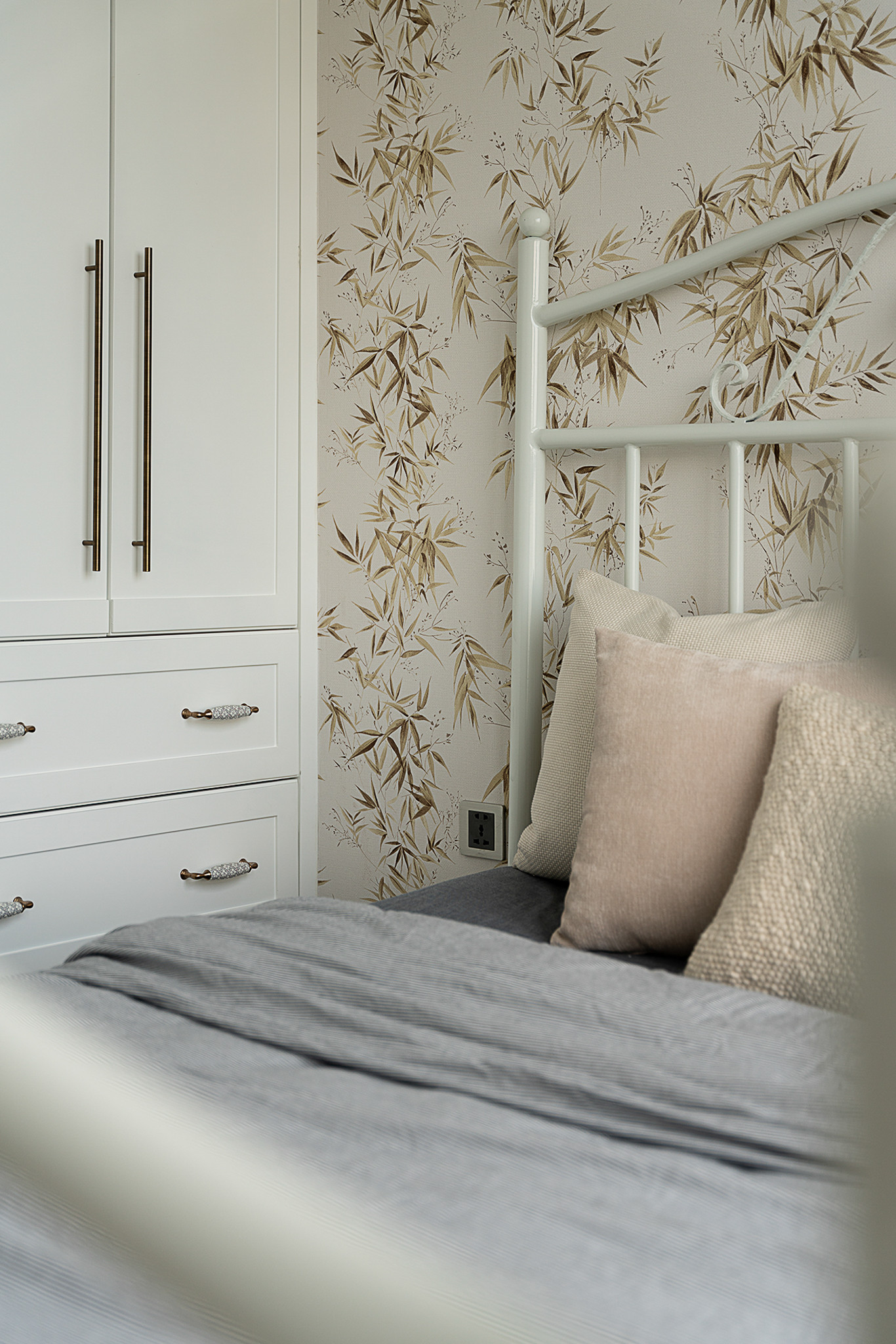 Màu nền trung tính tạo cảm giác thoải mái. Giấy dán tường họa tiết nổi bật trên nội thất trắng.