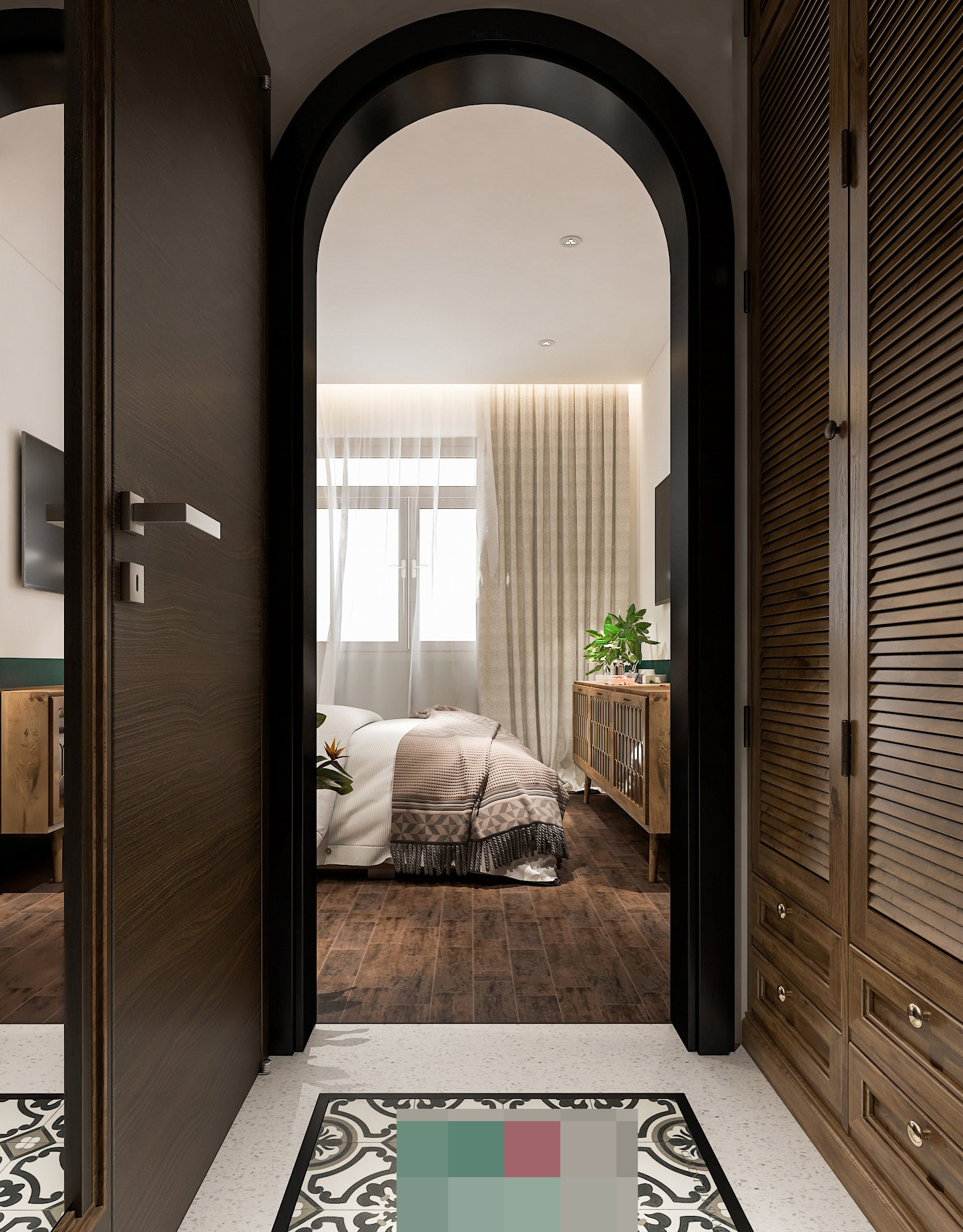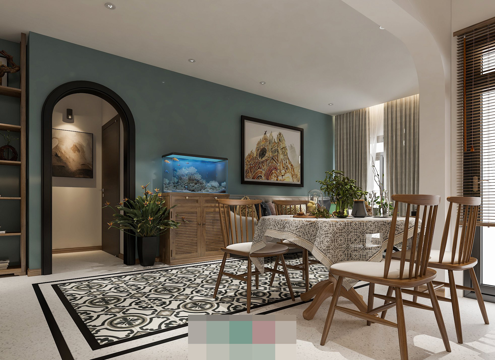 Điểm nhấn là các khung mái vòm được chăm chút kỹ lưỡng, nền gạch bông họa tiết đặc trưng được chọn lựa phù hợp với tổng thể thiết kế.