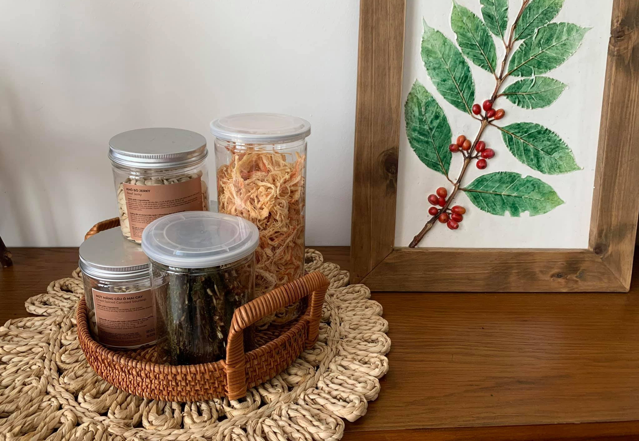 Chút đồ decor nhỏ nhưng nổi bật và tinh tế. Khung tranh gỗ, tấm lót cói và giỏ mây tre đan đưa đến sự gần gũi, mộc mạc.