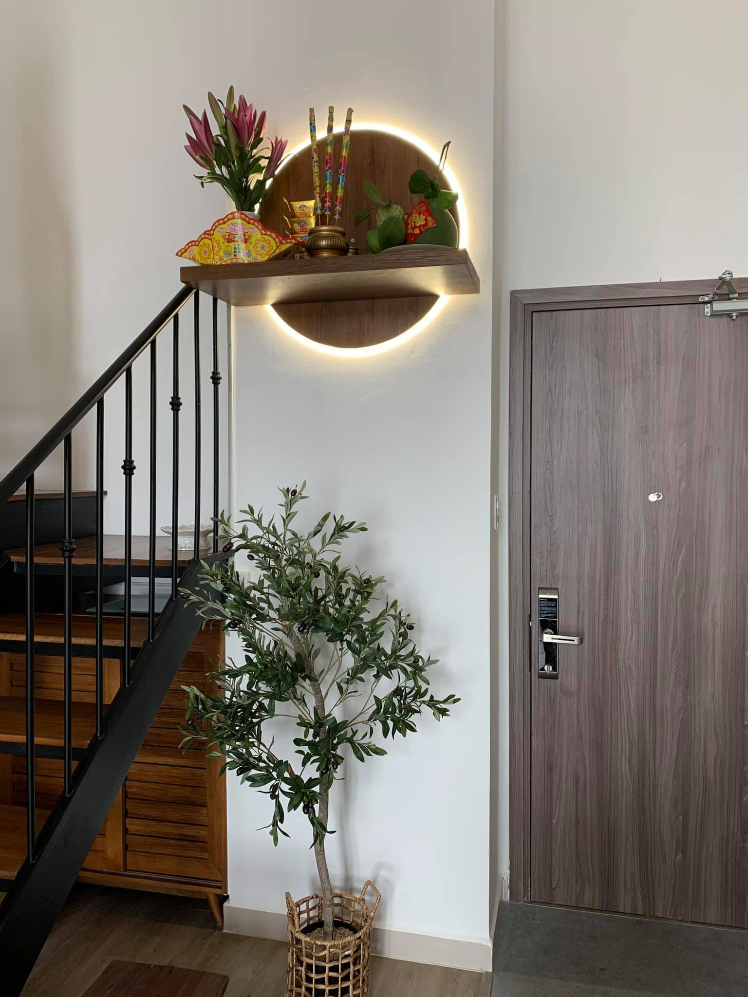 Cầu thang sắt, bệ gỗ an toàn mà tạo độ thoáng cho căn hộ. Phía dưới gầm là tủ giầy nhỏ.