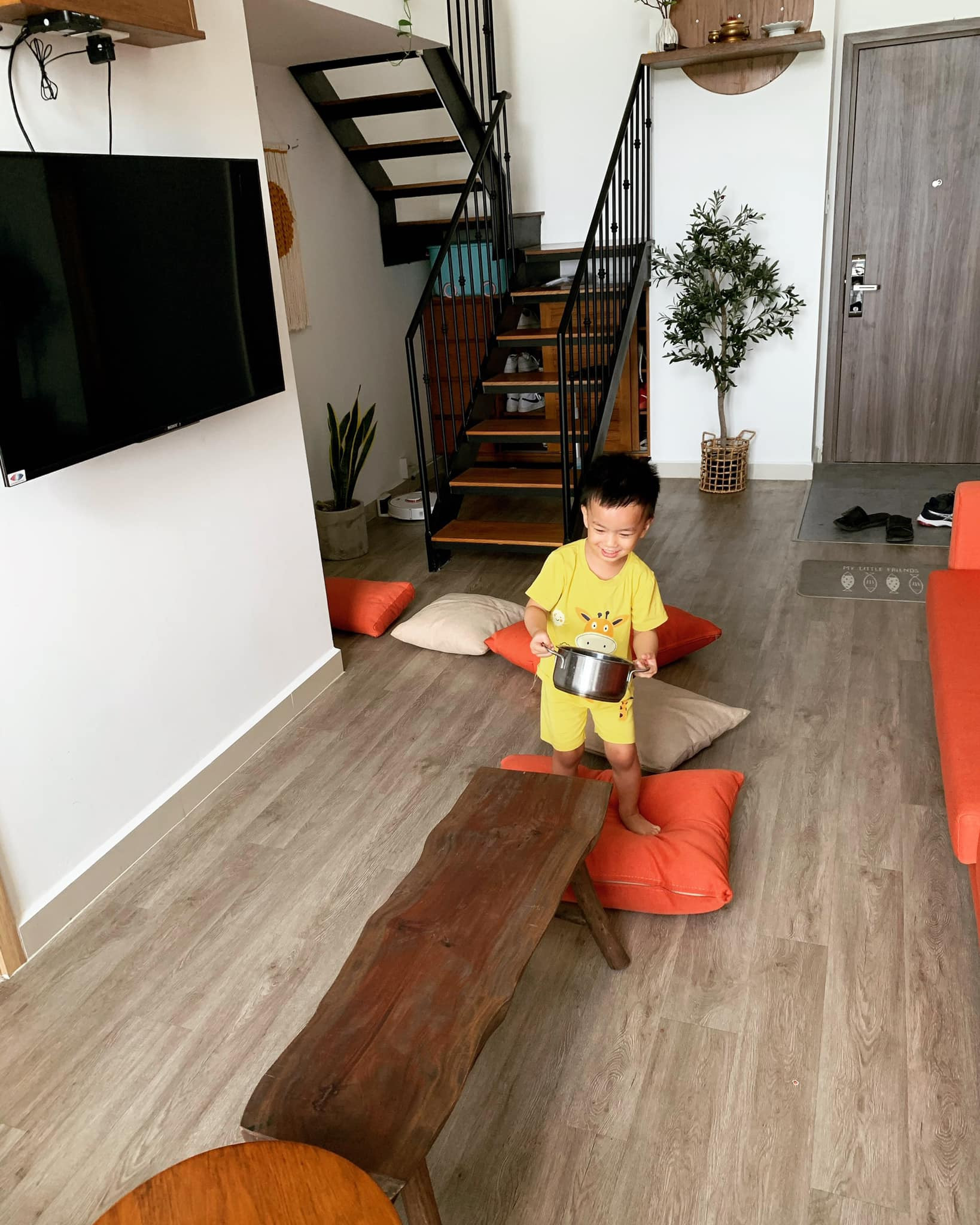 Những khung cảnh sinh hoạt đời thường và rất đỗi bình dị của gia chủ với con. Bé có tuổi thơ thỏa thích khám phá, sáng tạo trong căn hộ ấm cúng này.
