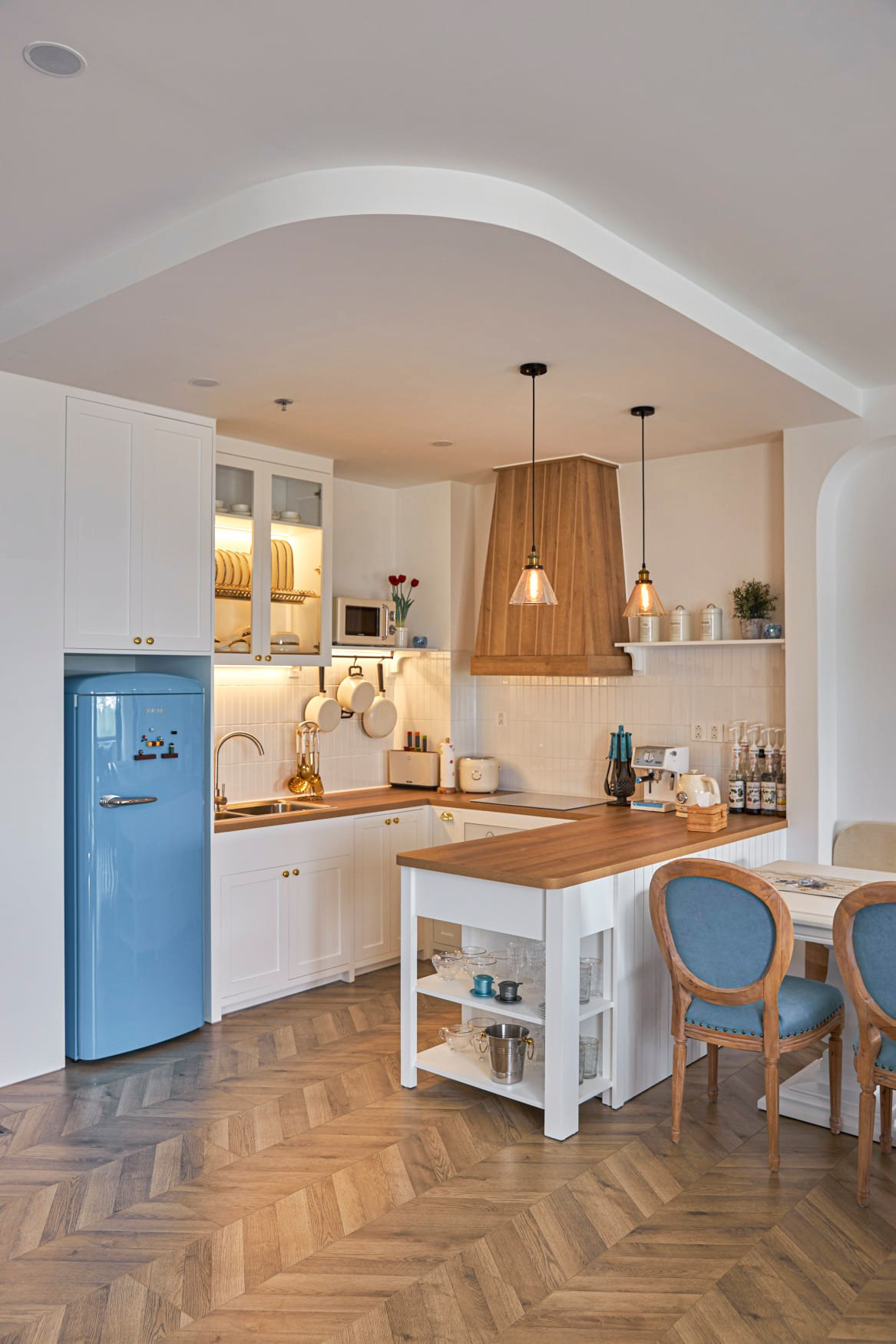 Những phá cách trong việc lựa chọn họa tiết, đồ thiết kế đưa căn hộ lên 1 tầm cao mới. Việc sử dụng sàn gỗ lát xương cá và cửa mái vòm tạo điểm nhấn hiệu quả. Sàn gỗ màu thô trầm làm nổi bật lên vẻ mộc mạc ấm cúng.