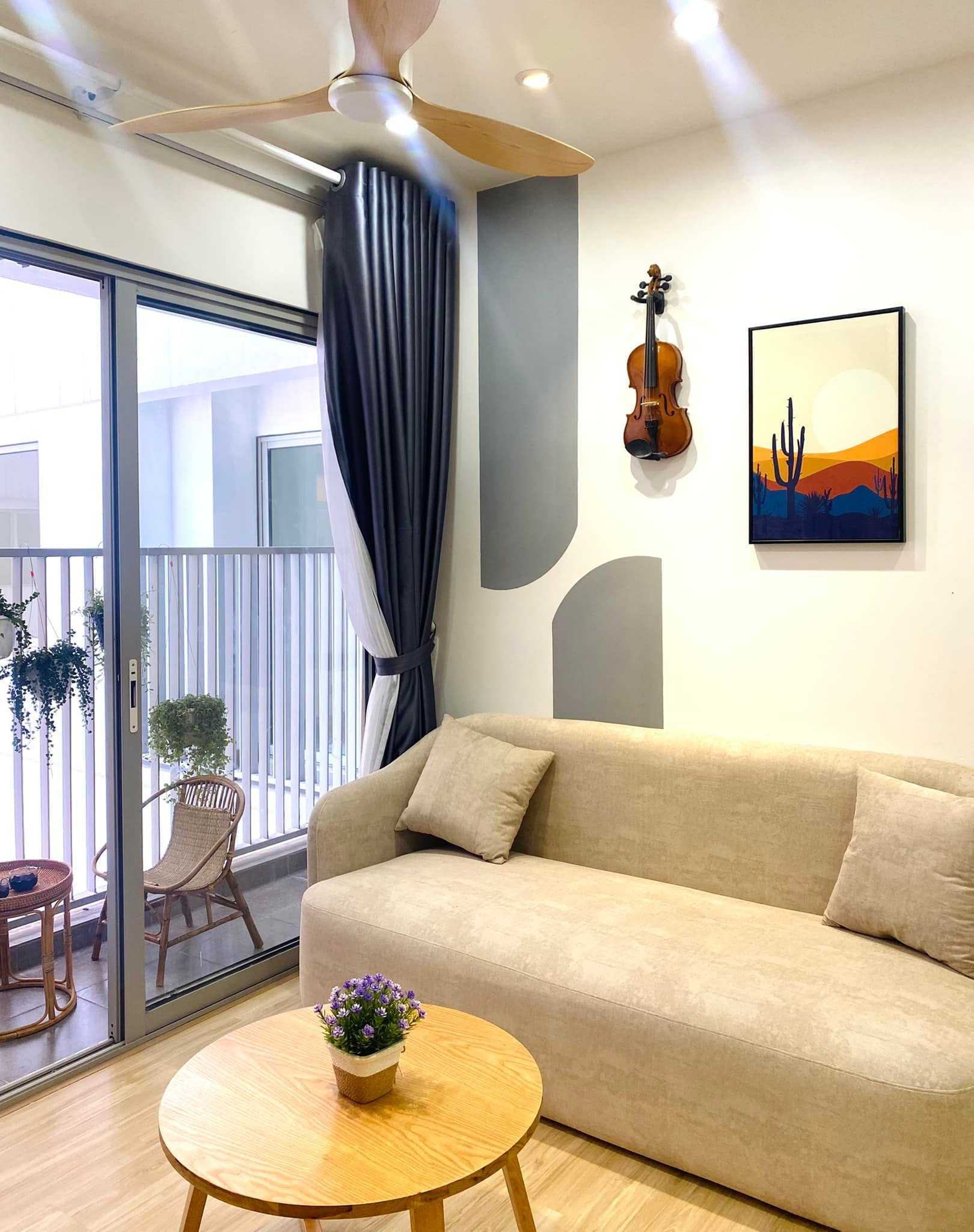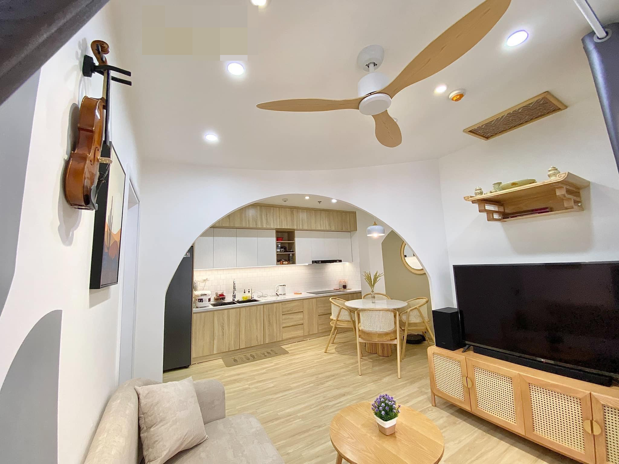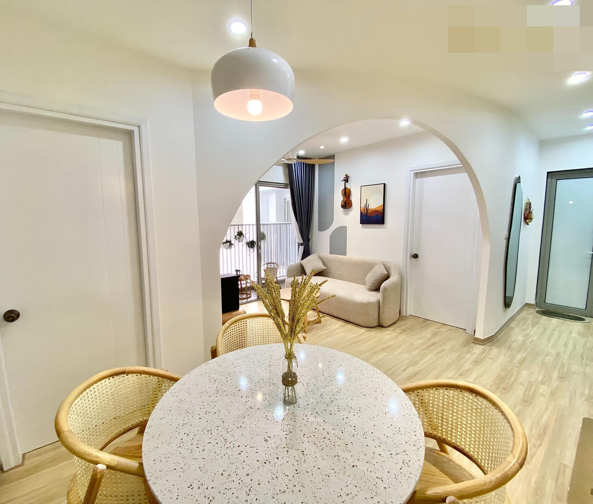 Căn hộ chung cư 53m2 nhỏ xinh với 2 phòng ngủ, 1 phòng khách ở đường Quang Trung (TP.Vinh, Nghệ An) của đôi vợ chồng trẻ.Chị Nguyễn Thị Thục Trinh chia sẻ, chị tự lên ý tưởng, chọn phong cách và gửi cho bên thiết kế, thi công.Phong cách chủ đạo là vintage Hàn Quốc. Nội thất đơn giản, nhẹ nhàng và ấm cúng. Vì là tổ ấm - nơi cùng gia đình trải qua mọi khoảnh khắc của cuộc sống, nên chị dành khá nhiều tâm huyết. Toàn bộ nội thất vợ chồng chị nghiên cứu, tự tay chọn lựa và sắm sửa. Phòng khách và bếp kết nối thông qua tường mái vòm. Bàn ăn tròn giúp tiết kiệm diện tích, cho nhà mềm mại và tạo sự sum vầy trong mỗi bữa ăn. “Vì tự tay làm nên ngôi nhà mình yêu thích nên tôi có cảm giác lúc nào cũng muốn về nhà để thư giãn sau 1 ngày bận rộn”, chị Trinh tâm sự. Góc chill ở ban công, nhìn vào nội khu rất mát mẻ và ít bụi.
