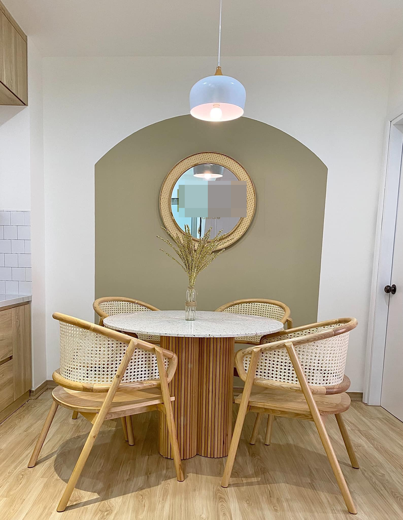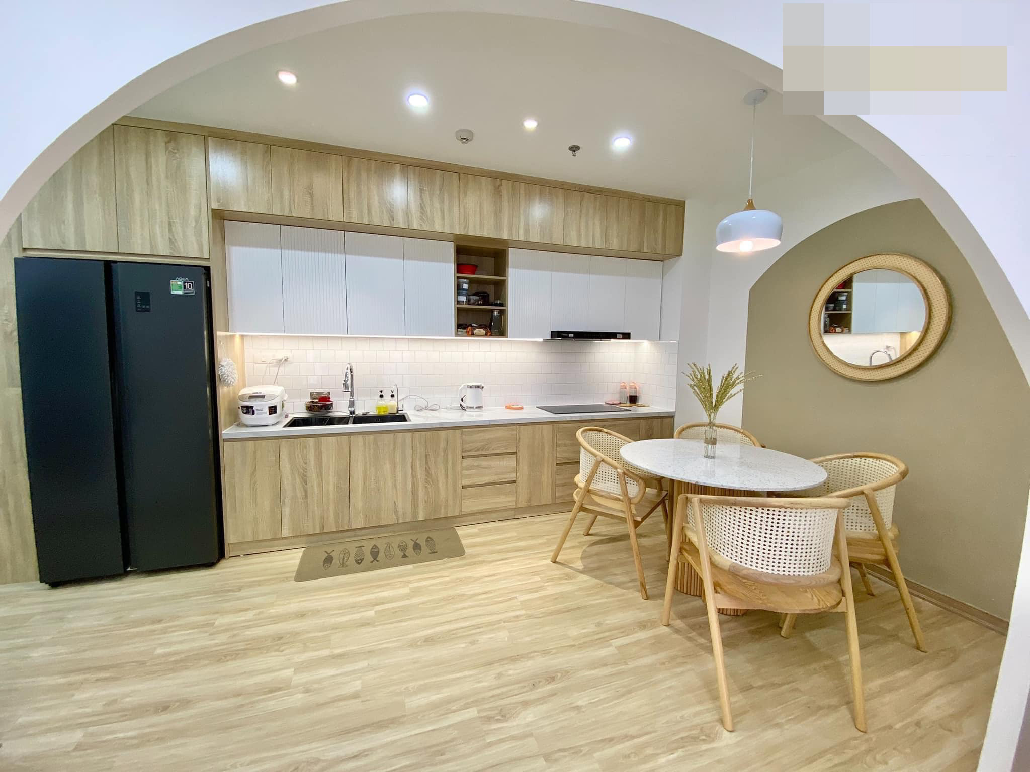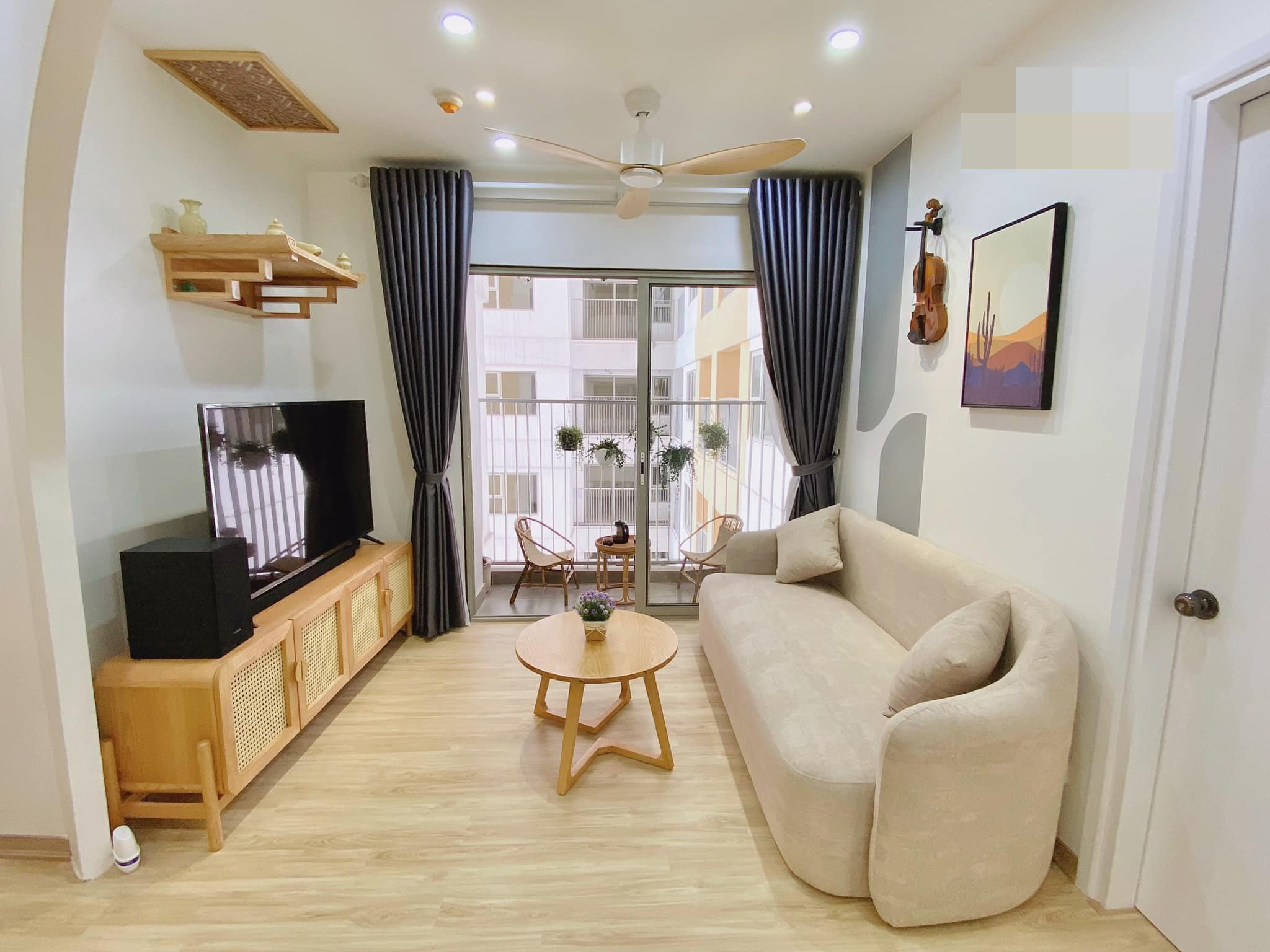 Căn hộ chung cư 53m2 nhỏ xinh với 2 phòng ngủ, 1 phòng khách ở đường Quang Trung (TP.Vinh, Nghệ An) của đôi vợ chồng trẻ.Chị Nguyễn Thị Thục Trinh chia sẻ, chị tự lên ý tưởng, chọn phong cách và gửi cho bên thiết kế, thi công.Phong cách chủ đạo là vintage Hàn Quốc. Nội thất đơn giản, nhẹ nhàng và ấm cúng. Vì là tổ ấm - nơi cùng gia đình trải qua mọi khoảnh khắc của cuộc sống, nên chị dành khá nhiều tâm huyết. Toàn bộ nội thất vợ chồng chị nghiên cứu, tự tay chọn lựa và sắm sửa. Phòng khách và bếp kết nối thông qua tường mái vòm. Bàn ăn tròn giúp tiết kiệm diện tích, cho nhà mềm mại và tạo sự sum vầy trong mỗi bữa ăn. “Vì tự tay làm nên ngôi nhà mình yêu thích nên tôi có cảm giác lúc nào cũng muốn về nhà để thư giãn sau 1 ngày bận rộn”, chị Trinh tâm sự. Góc chill ở ban công, nhìn vào nội khu rất mát mẻ và ít bụi.