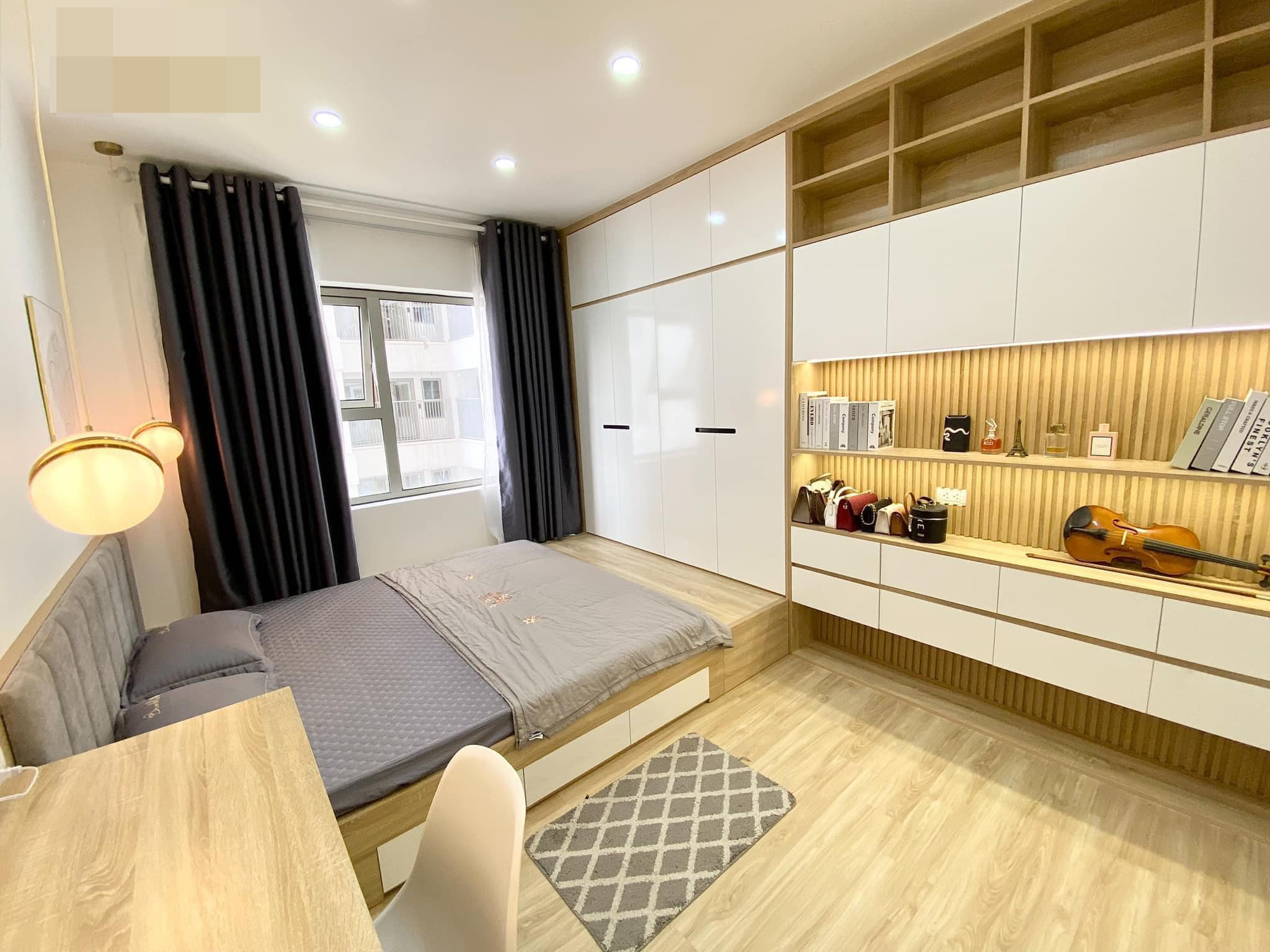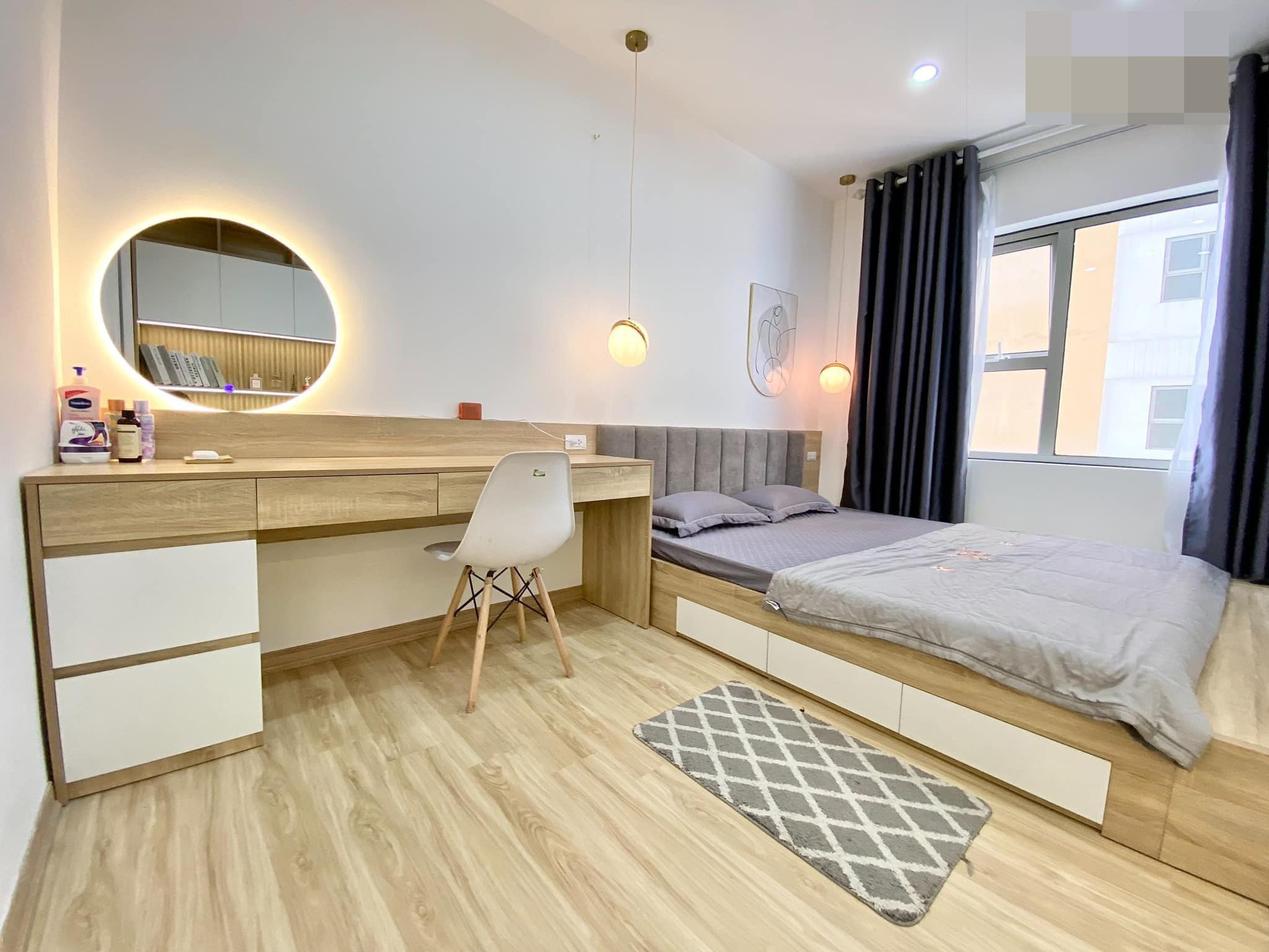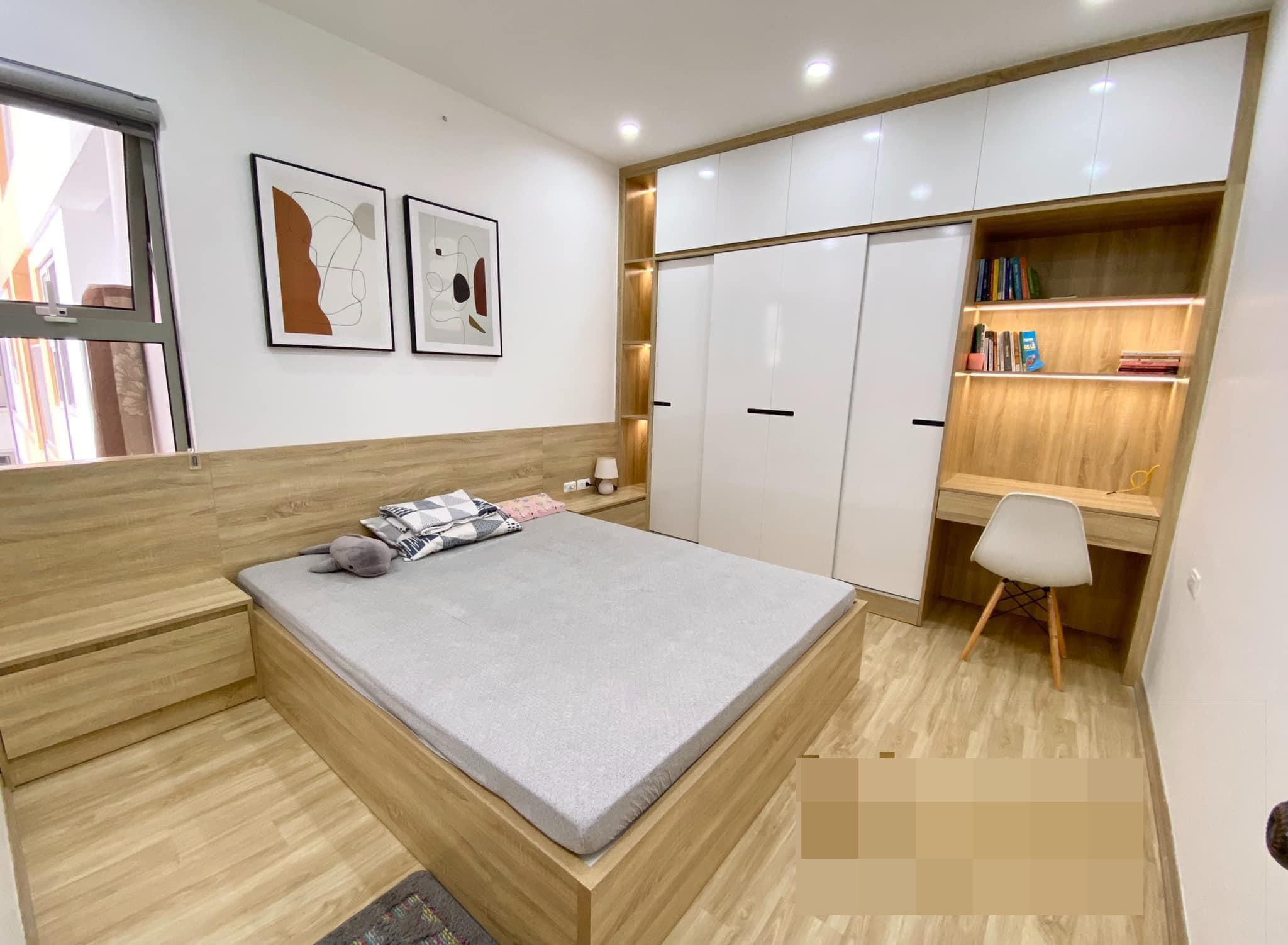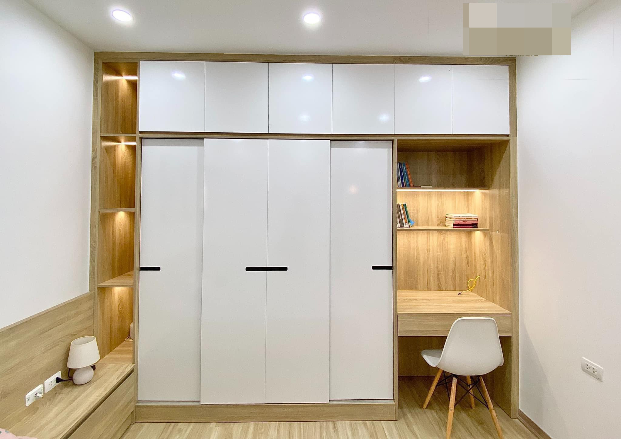 Phòng ngủ đơn giản, tủ và giường liền khối với cửa trượt tiết kiệm không gian. Phần giường thiết kế thêm các ngăn kéo đựng đồ tiện dụng, gọn gàng. Bàn trang điểm tích hợp bàn làm việc.