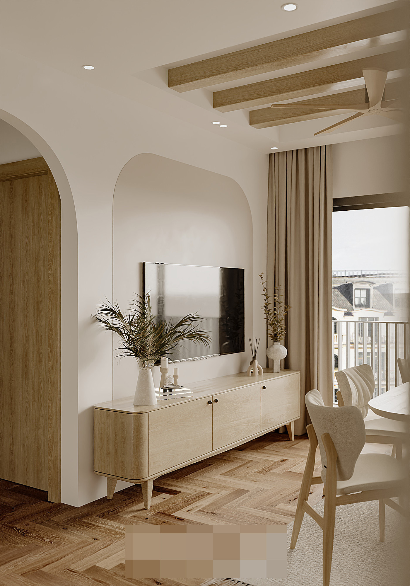 Kệ tivi đơn giản, ít chi tiết rườm rà, đúng với tinh thần Japandi. Một mảng tường được dựng thạch cao, tạo hốc và gắn đợt gỗ làm thành chiếc kệ nhỏ gọn, tinh tế. Ở đây gia chủ bày biện sách và đồ decor.