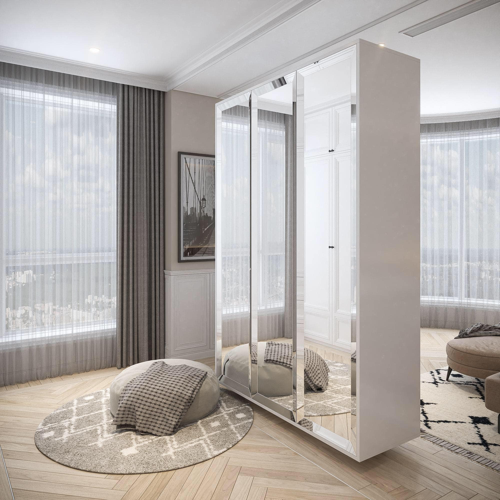 Phòng ngủ master chia làm hai không gian, 1 bên là nơi ngủ và 1 bên là phòng thay đồ, làm việc và đọc sách. Tủ quần áo với gương kính hiện đại đối diện là tủ lớn hơn, thiết kế kiểu cổ điển.