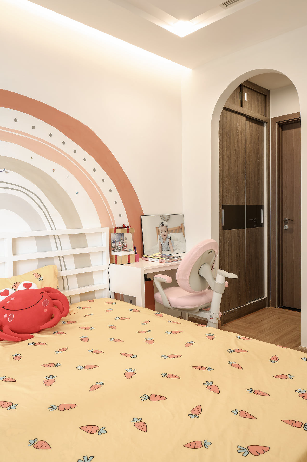 Cách xử lý tủ quần áo của nhóm khá hay khi dựng vách thạch cao rồi tạo tủ âm tường, vừa ngăn cách với bàn học, giường ngủ lại tạo ra khoảng đệm thú vị.