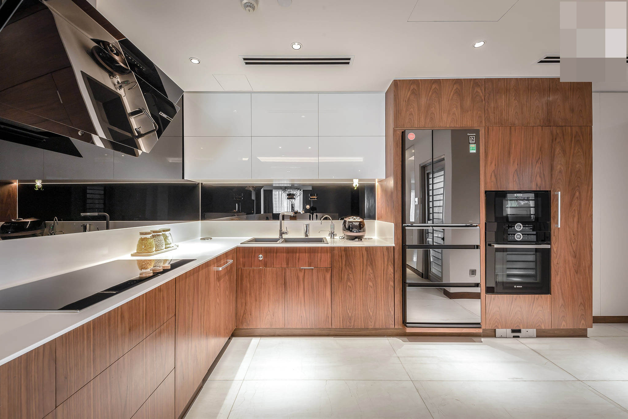 Bếp sang trọng với thiết bị nấu tích hợp với điện thoại, trường hợp có nguy cơ cháy, điện thoại sẽ có chuông cảnh báo. Khu vực này được dành một diện tích khá rộng vì chủ nhân thích nấu nướng, thử nghiệm những món ăn mới. Tủ lạnh, lò nướng, máy hấp được đặt trong hệ tủ lớn. Hệ tủ này có chức năng đựng đồ khô hoặc thiết bị nấu khác như: Nồi chiên không dầu, dụng cụ làm bánh...