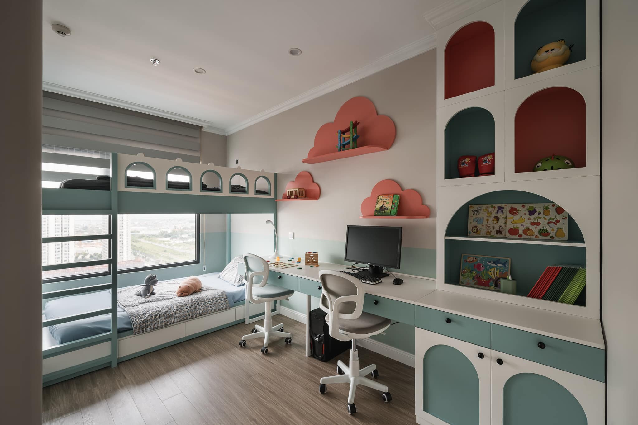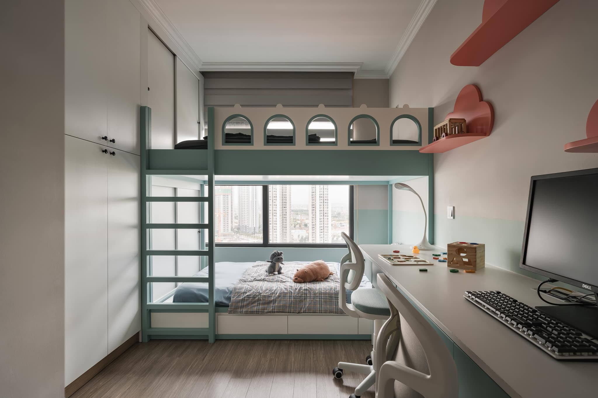 Phòng ngủ của hai bé với giường tầng và bàn học đôi màu xanh cá tính.