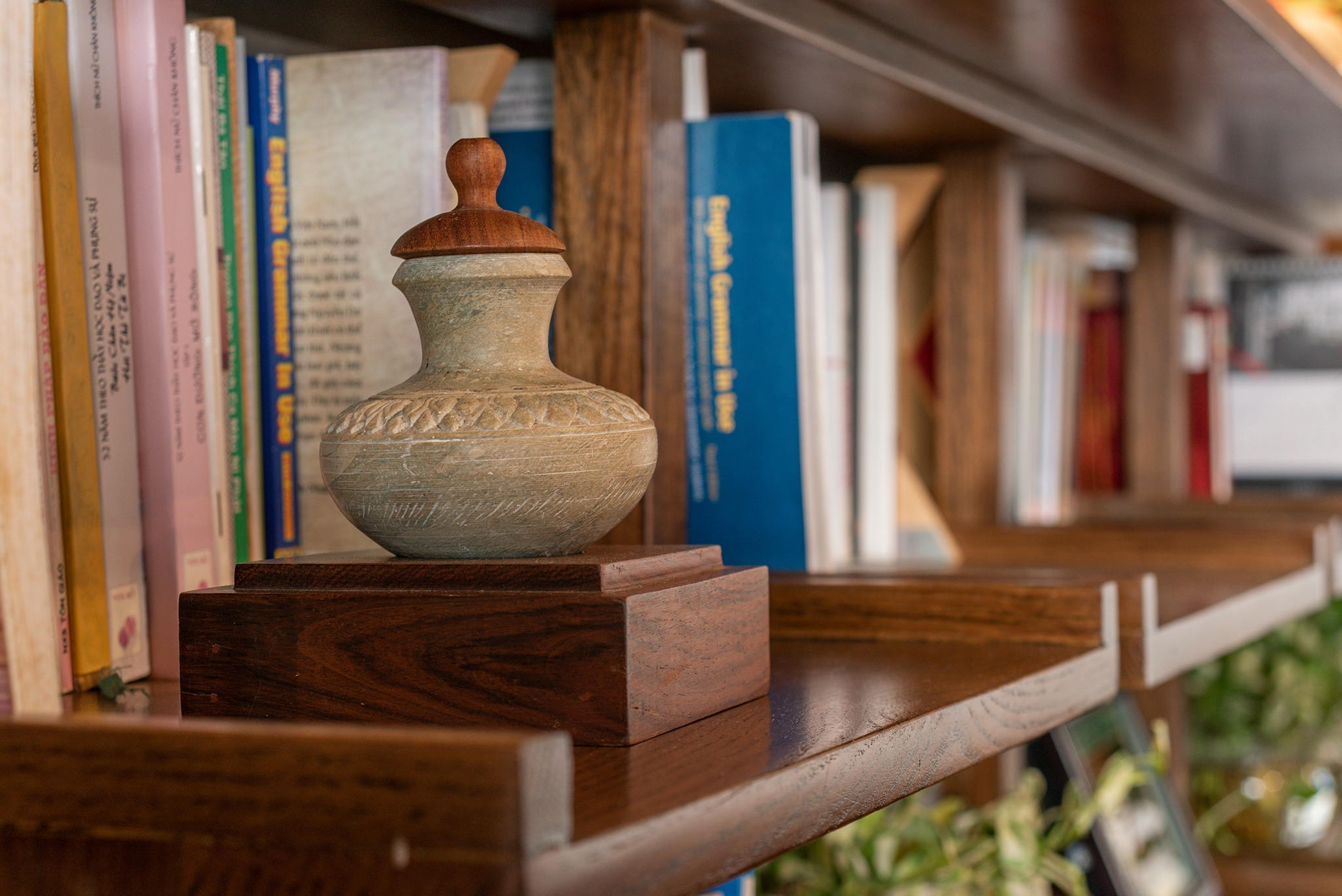Nhóm kiến trúc sư thi công nội thất và gia chủ muốn tạo ra một không gian đẹp tĩnh lặng, nên chị chọn những bức tranh mang màu sắc thiền, màu sắc và kiểu dáng của nội thất cũng theo tông màu trầm ấm.