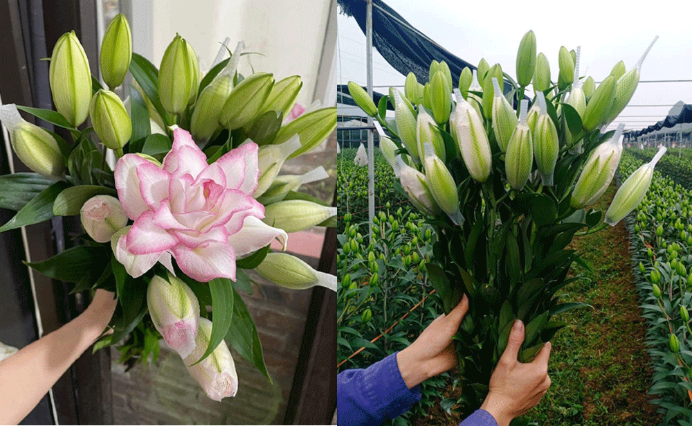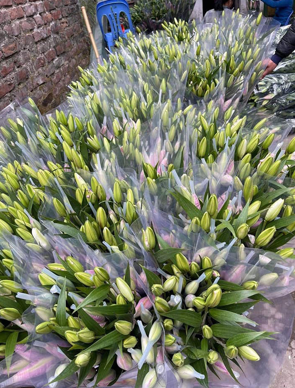 Hiện, hoa ly kép trắng viền hồng và ly kép hồng đậm ngày nào chị cũng về một chuyến. Hoa được các nhà vườn ở Mộc Châu (Sơn La) cắt và đóng gói vào chiều hôm trước rồi gửi xe xuống Hà Nội. Sáng hôm sau, chị nhận rồi giao cho khách đã đặt. Hoa được chị bán theo set 5 hoặc 10 cành.