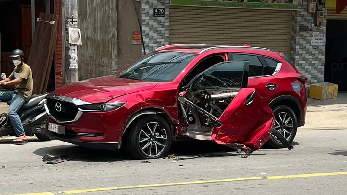 Tại hiện trường, phần cửa bên lái chiếc Mazda CX5 hư hỏng nặng. Rất may, tài xế không bị thương.