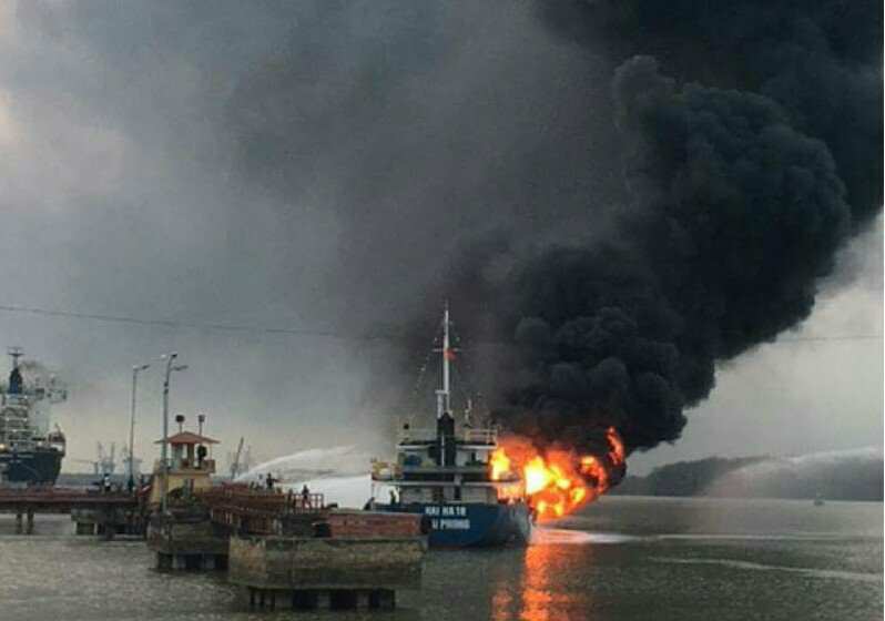 Tàu chở dầu Hải Hà 18 bốc cháy dữ dội tại Cảng Đình Vũ, Hải Phòng trong chiều tối 10/3.