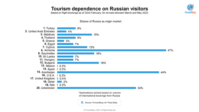 Tuy nhiên, mọi thứ đã thay đổi sau căng thẳng Nga - Ukraine. Các điểm đến có tỷ lệ huỷ chuyến ngay trong ngày 24/2 là Síp (300%), Ai Cập (234%), Thổ Nhĩ Kỳ (153%), Anh (153%), Armenia (200%) và Maldives (165%). Sự vắng mặt của khách Nga sẽ giáng một đòn lớn vào những điểm du lịch phụ thuộc vào lượng khách này.