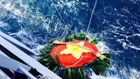 Những vòng hoa được kết từ đất liền mang theo trên tàu CSB 8001 được chuẩn bị dây để thả trôi. Đó là những vòng hoa đặc biệt nhất kết theo hình cờ Tổ quốc.