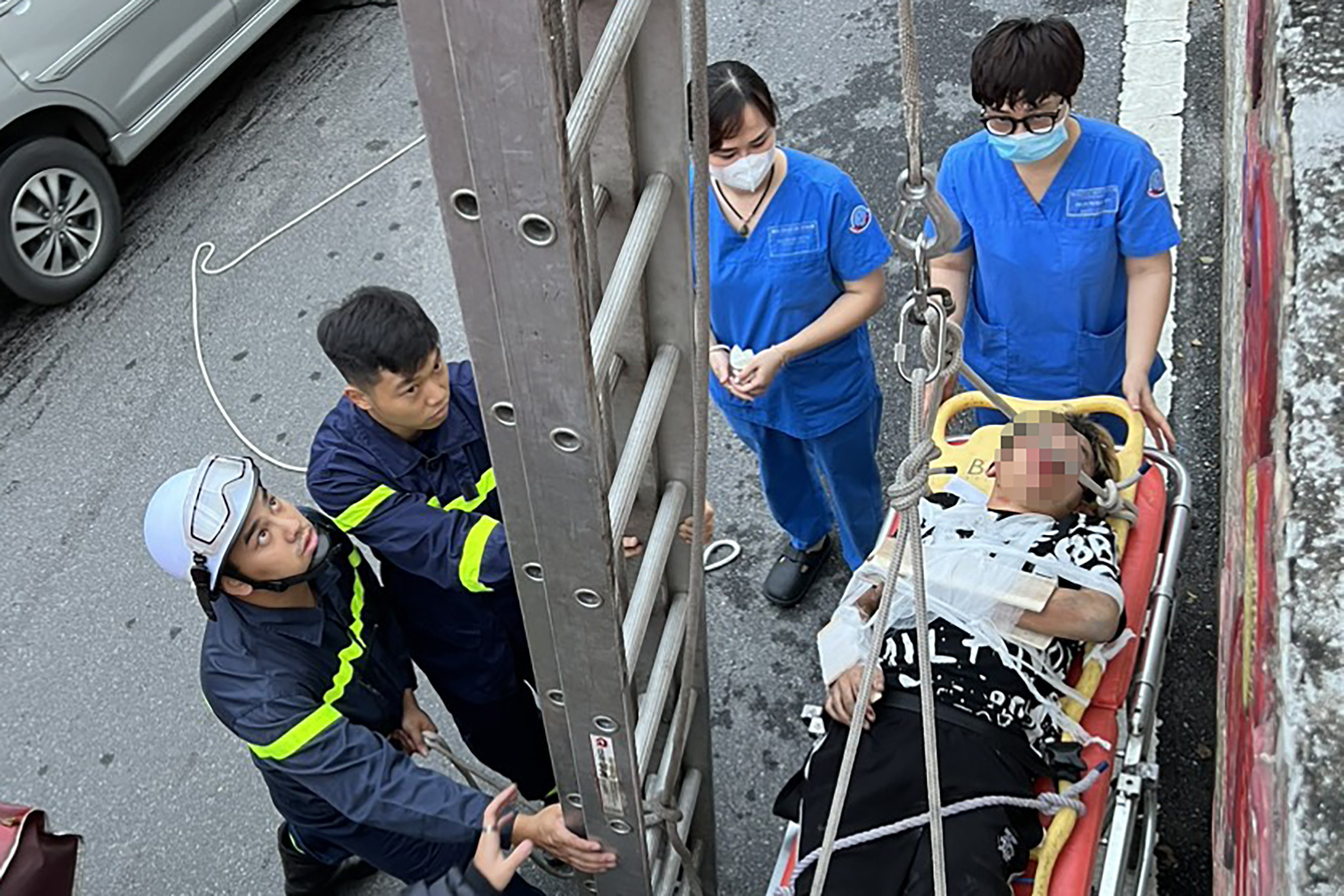 Tại hiện trường, lực lượng cứu hộ cứu nạn đã sử dụng thang, cáng, giá treo... phối hợp cùng lực lượng y tế 115 để đưa nạn nhân bị mắc kẹt đi cấp cứu tại Bệnhh viện Xanh Pôn.