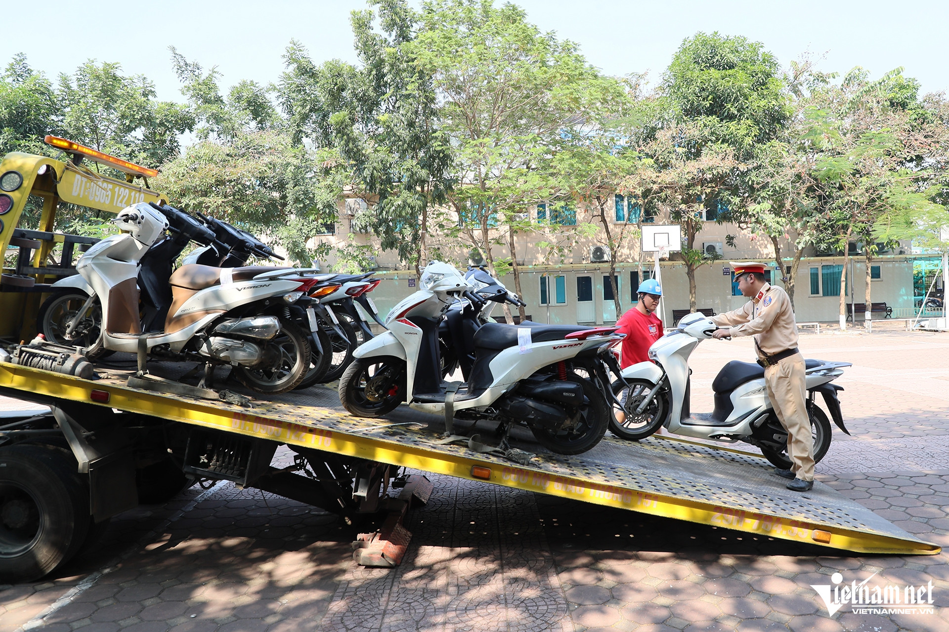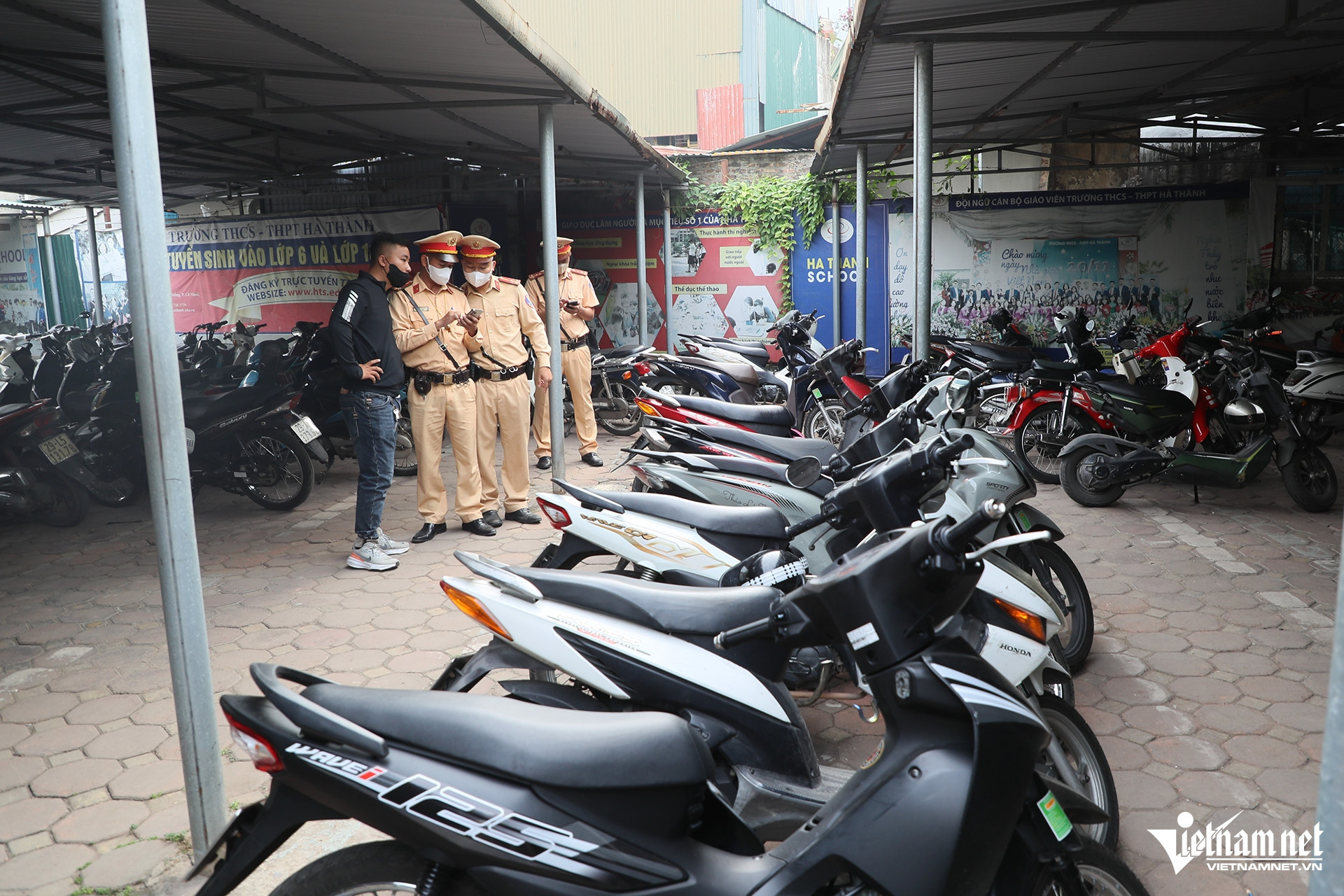 Lực lượng CSGT đã mời Ban Giám hiệu nhà trường và Công an phường Cổ Nhuế 1 (quận Bắc Từ Liêm) cùng kiểm tra, kiểm đếm phương tiện và chứng kiến việc lập biên bản với học sinh vi phạm.