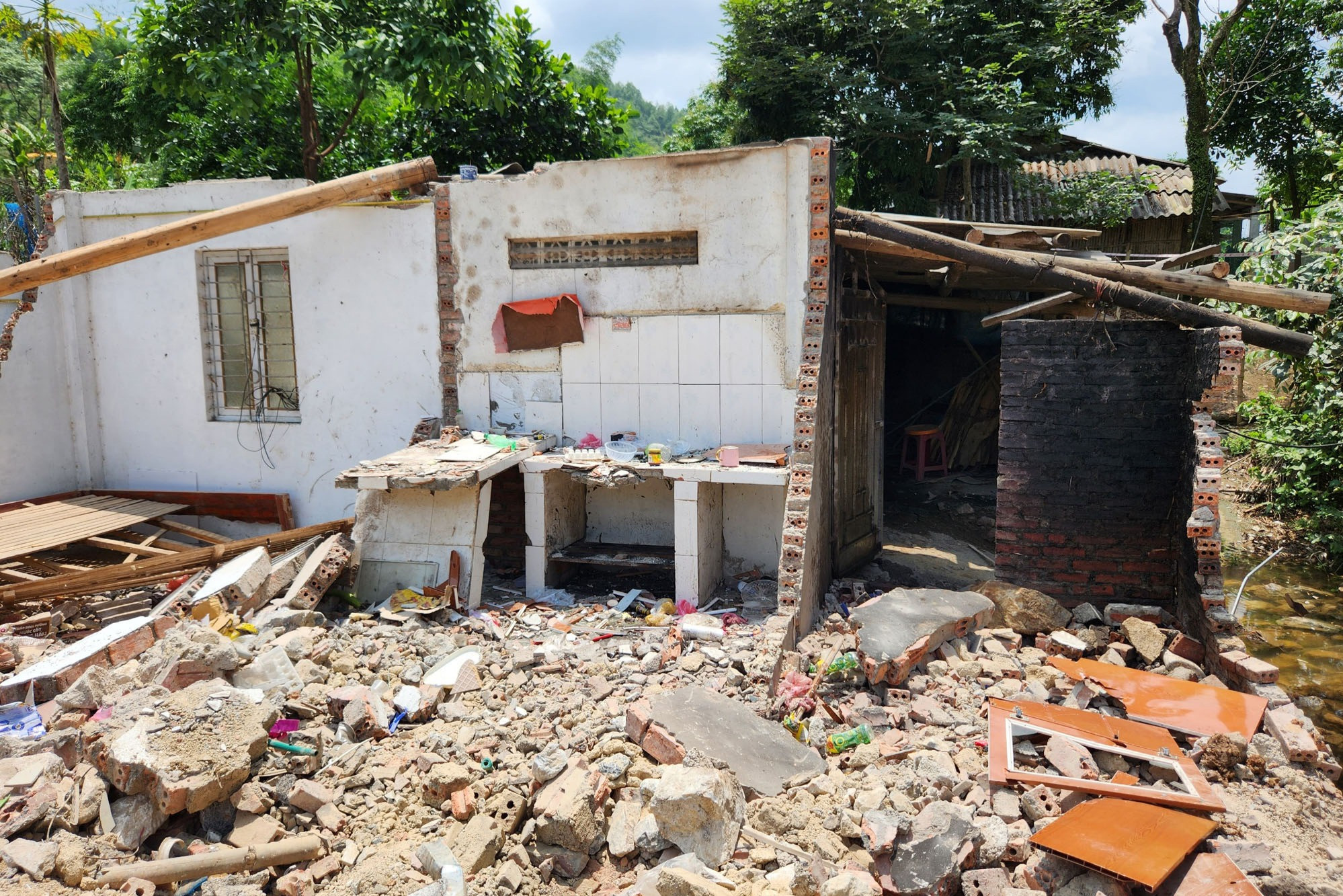 Vụ sập bờ kè ở phường Duyệt Trung (TP Cao Bằng, tỉnh Cao Bằng) gần như xóa sổ căn nhà mà ba mẹ con chị Trương Thị N. đang sinh sống.