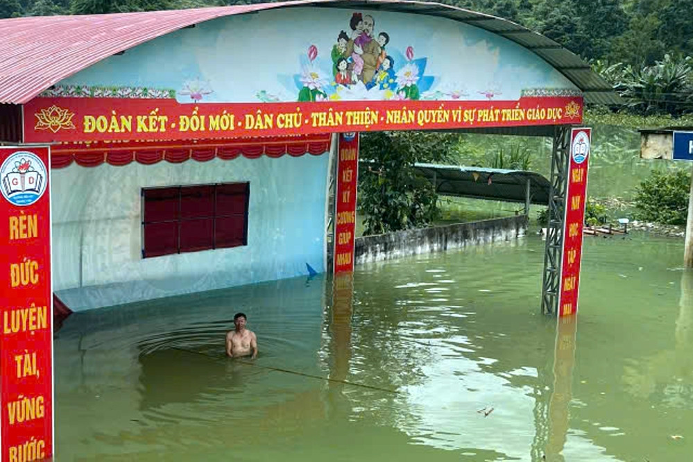 Lo lắng về cơ sở vật chất và hơn 1 tấn gạo ăn ở trường bị nước nhấn chìm, hiệu trưởng Trường Tiểu học Quang Vinh đi 40km để đến trường rồi bơi vào để kiểm tra.