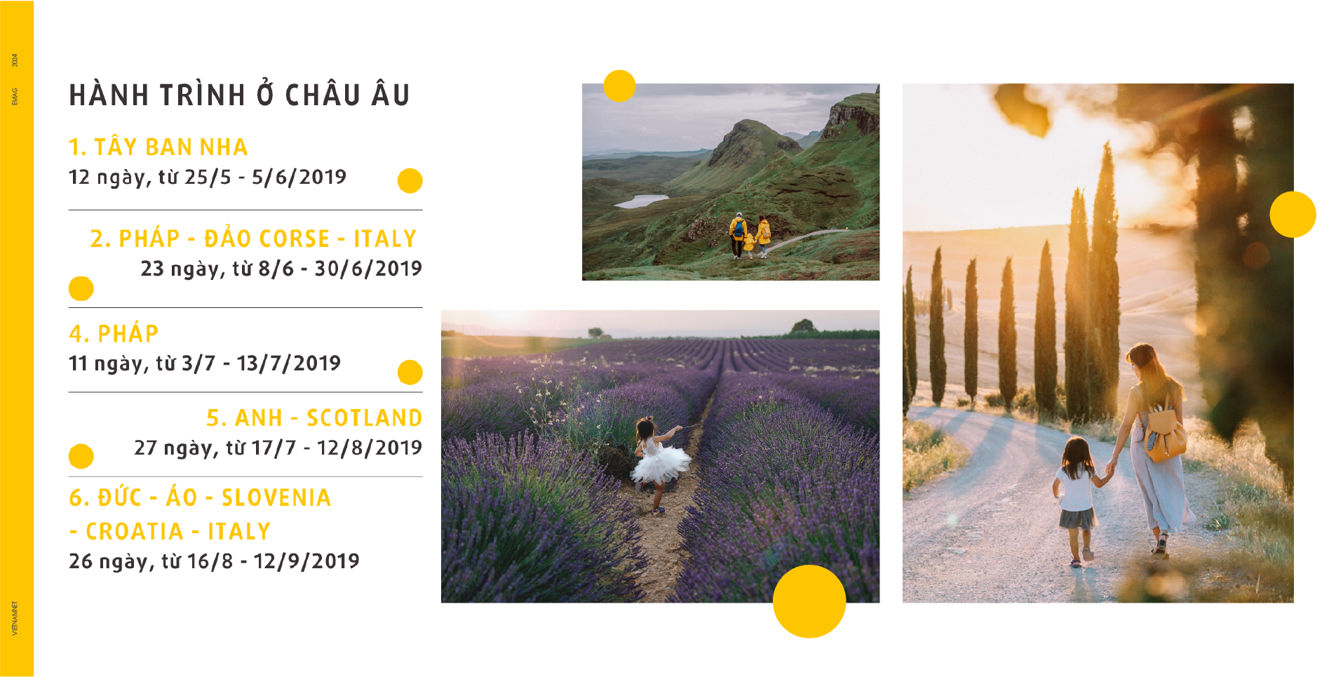 Vợ chồng anh Vinh cùng con gái Đặng Chloé 2,5 tuổi từ Paris tới Nhật Bản (15 ngày từ 23/4-7/5), Hàn Quốc (15 ngày, từ 8/5-22/5); Tây Ban Nha (12 ngày từ 25/5 - 5/6); Pháp - đảo Corse - Italy (23 ngày từ 8/6 - 30/6); Pháp (11 ngày từ 3/7 - 13/7); Anh - Scotland (27 ngày từ 17/7 - 12/8); Đức - Áo - Slovenia - Croatia - Italy (26 ngày từ 16/8 - 12/9). Hành trình kết thúc bằng hai chuyến road trip 15 ngày ở Canada (15/9 - 30/9) và 26 ngày đi dọc bờ Tây nước Mỹ (5 - 31/10).