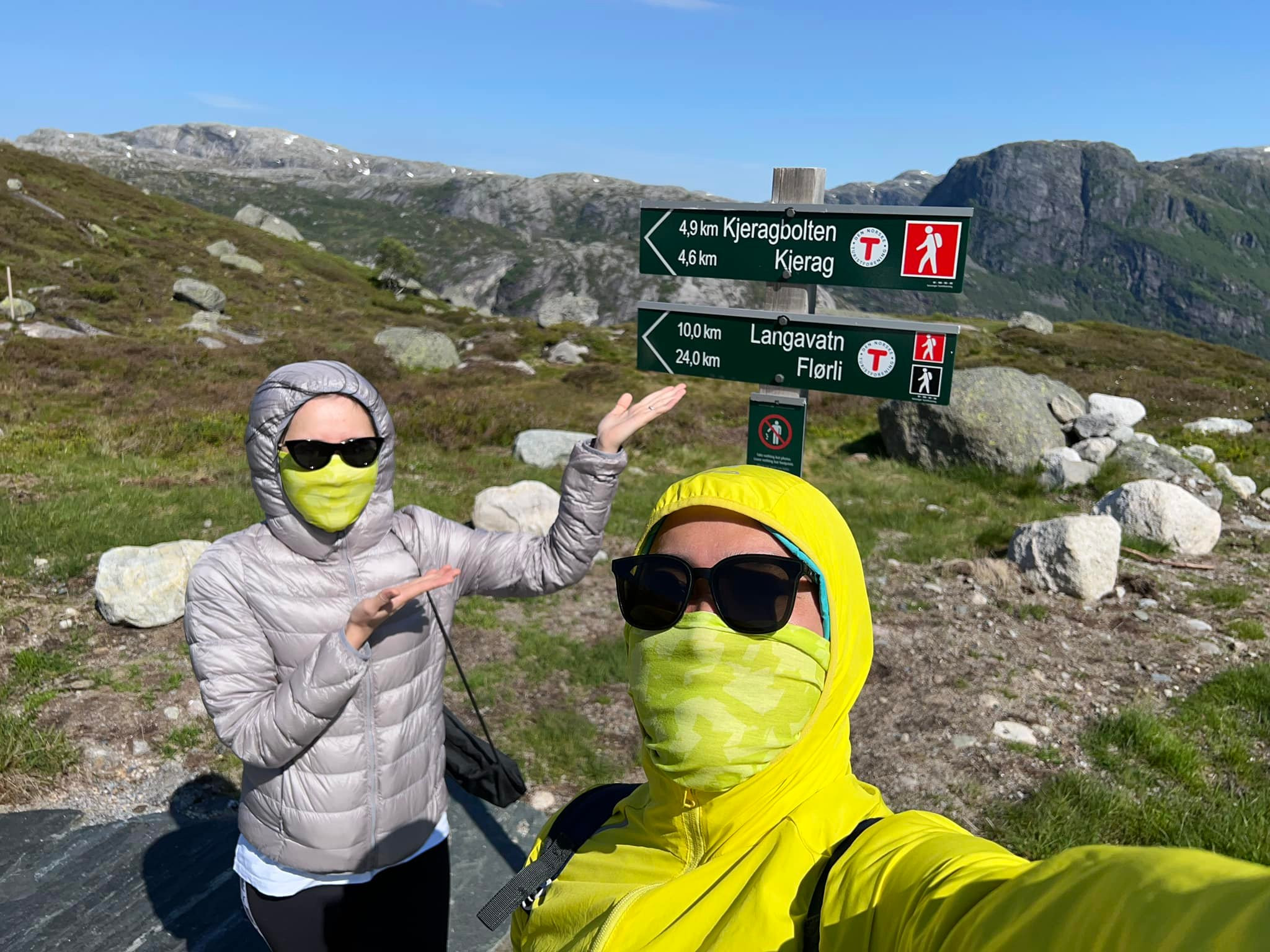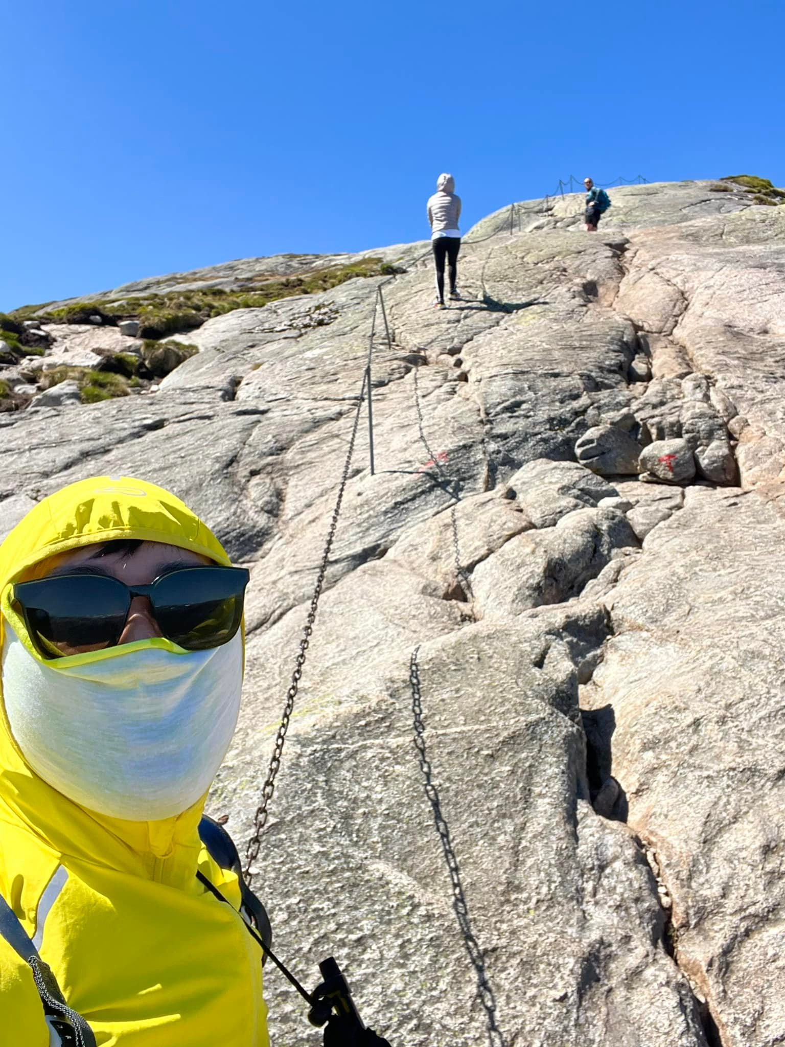 Điểm chung của cặp đôi này là yêu thích chinh phục những nơi hoang sơ, mạo hiểm, sẵn sàng trèo núi, vượt rừng, đi bộ hàng chục km. "Địa điểm sợ hãi nhất với mình là hòn đá khổng lồ nằm “lọt thỏm” giữa 2 vách núi Kjerag. Mình thấy quá liễu lĩnh. Đến nay chỉ nghĩ lại mình cũng thấy rùng mình”, Hoàng Anh cho biết.