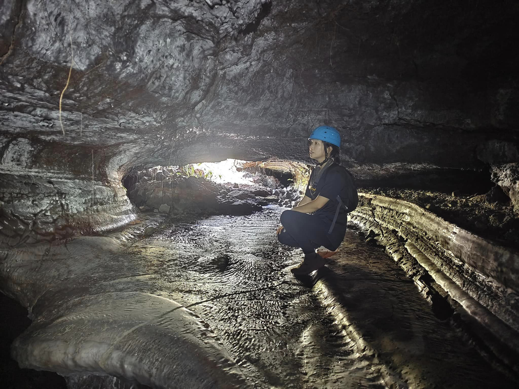 Chị An thích thú khám phá các hang động, núi lửa ở quê chồng.