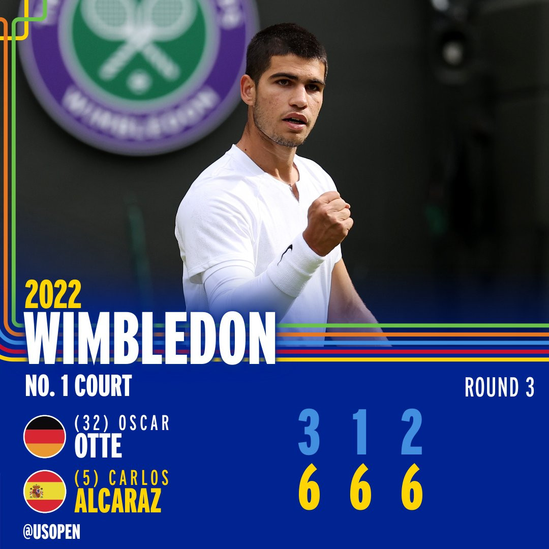 Carlos Alcaraz vẫn chưa có đối thủ ở Wimbledon 2022Tay vợt 19 tuổi người Tây Ban Nha chỉ mất 3 set để giành vé vào vòng 4Ở vòng 4, hạt giống số 5 sẽ chạm trán Jannik Sinner