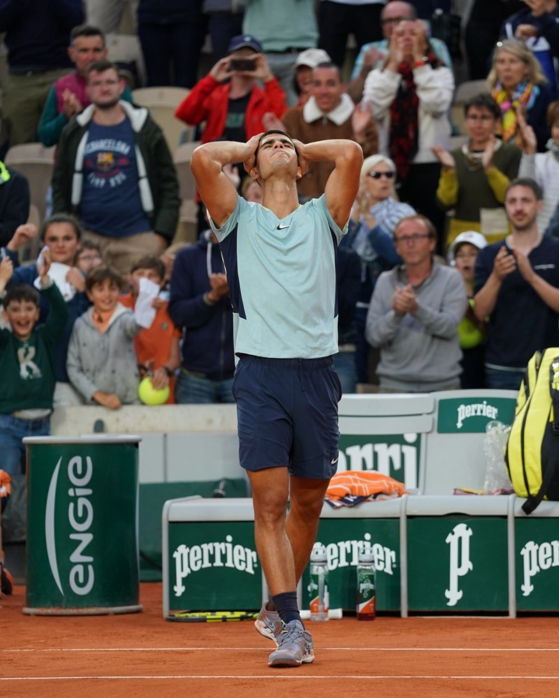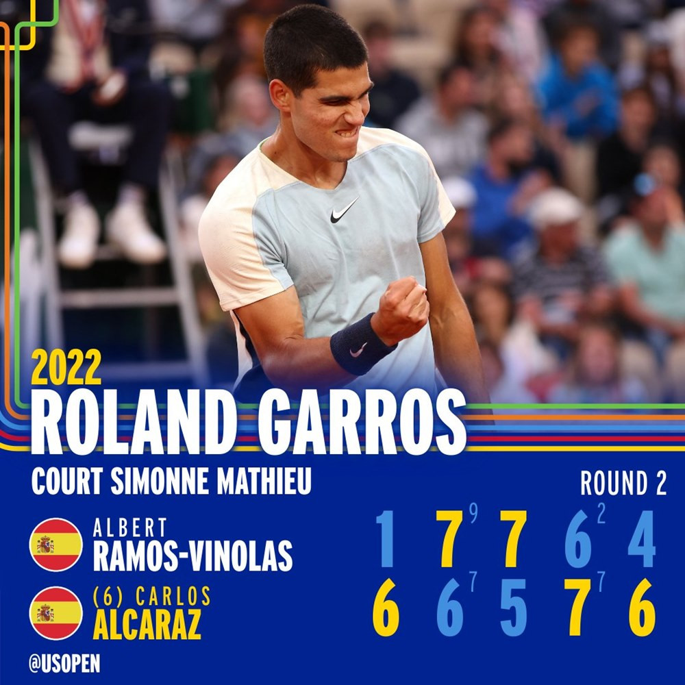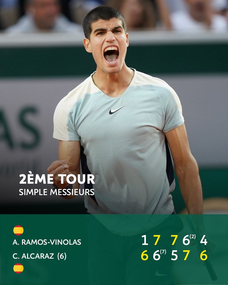 Carlos Alcaraz cần tới 5 set mới có thể đánh bại tay vợt hạng 44 thế giới Albert Ramos-Vinolas với điểm số 6-1, 6-7 (7), 5-7, 7-6 (2), 6-4 để ghi tên mình vào vòng 3 Pháp mở rộng.