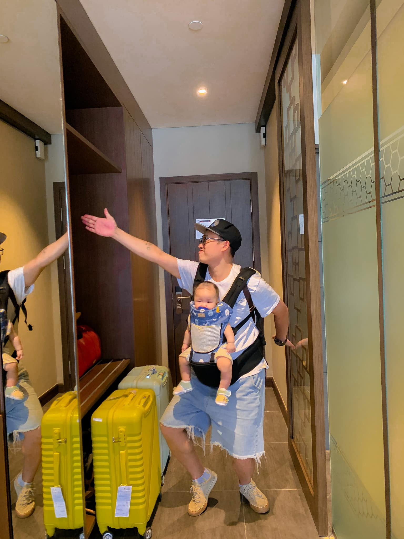 "Vợ mình cũng rất cẩn thận khi chọn đồ ăn để đảm bảo lượng sữa sinh dưỡng cho con. Bé Khoai vẫn bú sữa mẹ hoàn toàn", anh Hóa cho biết. Du đi du lịch nhưng cặp đôi vẫn giữ lịch sinh hoạt đều đặn cho con và chỉ căn giờ con thức để đi địa điểm ngoài khu nghỉ. "Nếu con có dấu hiệu mệt mỏi, không thoải mái, nhà mình sẽ dừng kế hoạch di chuyển xa ngay để ưu tiên sức khỏe cho con", anh Hóa cho biết.
