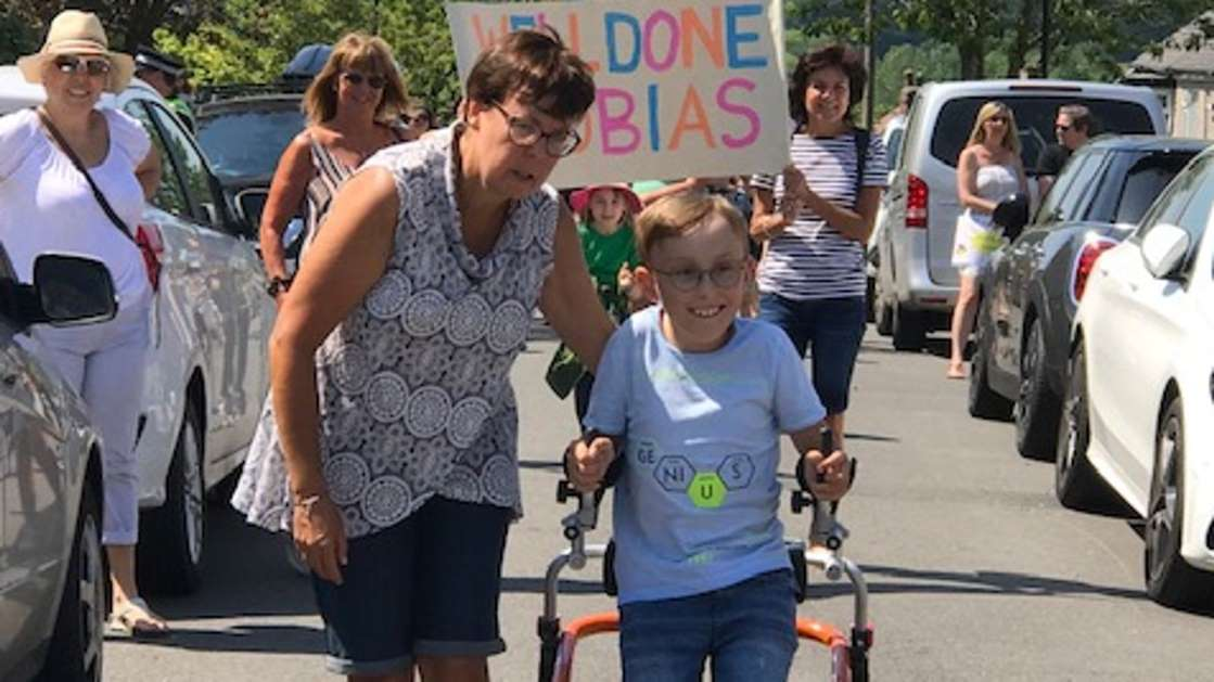 Những người hàng xóm đã vỗ tay cổ vũ bé Tobias Weller khi bé hoàn thành 750m đi bộ trên những con phố gần nhà em ở Sheffield.