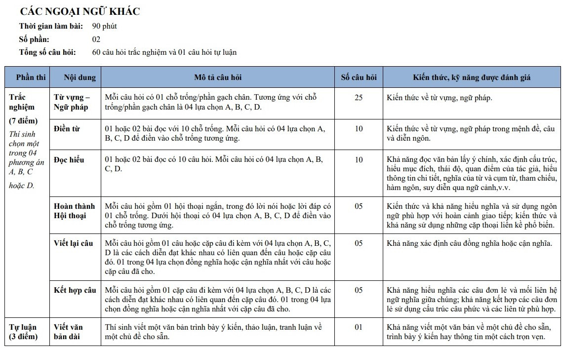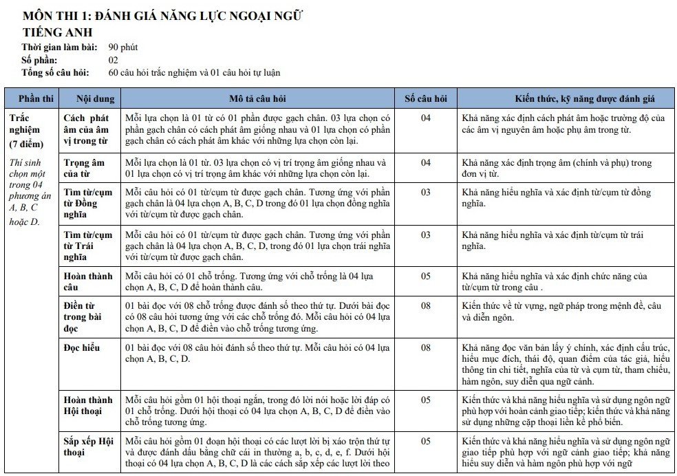 Môn thi 1 là Đánh giá năng lực ngoại ngữ với 2 phần, thời gian làm bài 90 phút, gồm 60 câu hỏi trắc nghiệm và 1 câu tự luận. Môn thi 1 có thể là tiếng Anh hoặc ngoại ngữ khác.