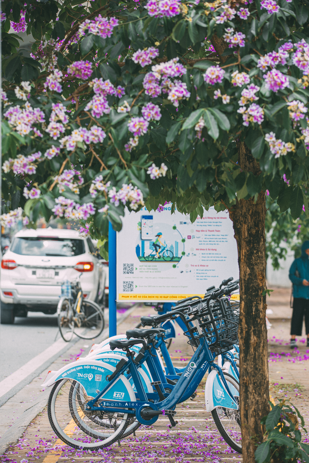 Nổi bật nhất trong hàng cây là một cây với tán lớn, cao vừa tầm, nằm ngay sát khu vực để xe đạp công cộng. Cây có dáng thẳng đứng, hoa nở căng đều, tán thấp, rất thuận tiện để có thể chụp ảnh, check-in.