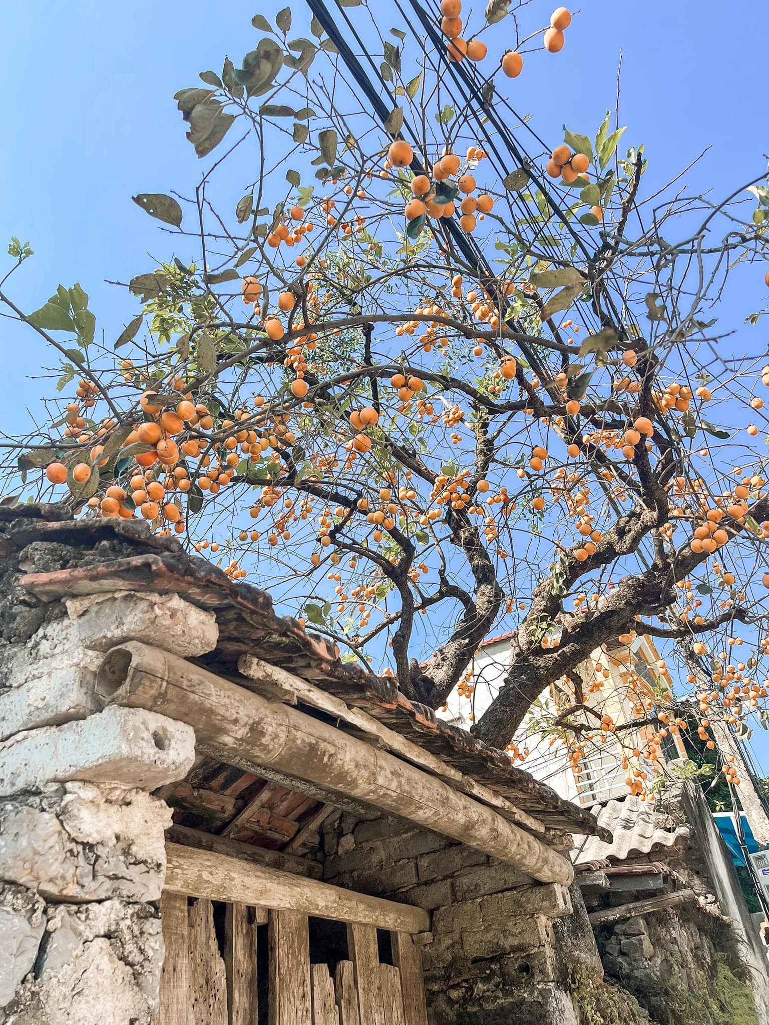 Hình ảnh cây hồng cổ sai trĩu quả nằm kề những góc tường đá phủ rêu xanh tạo nên một khung cảnh đậm chất vùng quê Bắc bộ xưa (Ảnh: Chu Phương Linh)