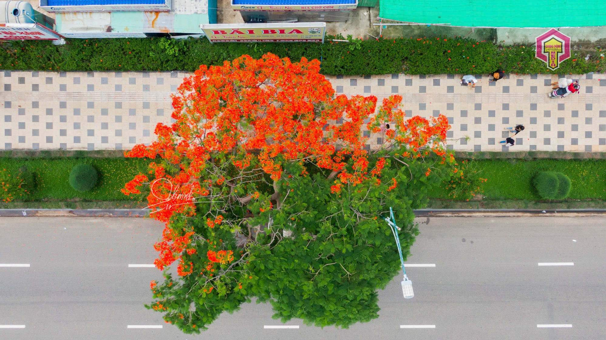 Vài ngày qua, cây hoa phượng: Nửa xanh ngắt màu lá, nửa đỏ rực màu hoa tại Vũng Tàu đang thu hút hàng trăm người dân, du khách hiếu kì tìm tới chiêm ngưỡng, chụp ảnh. Nhìn từ trên cao, tán cây như đối xứng, tạo nên hai mảng màu tách biệt.