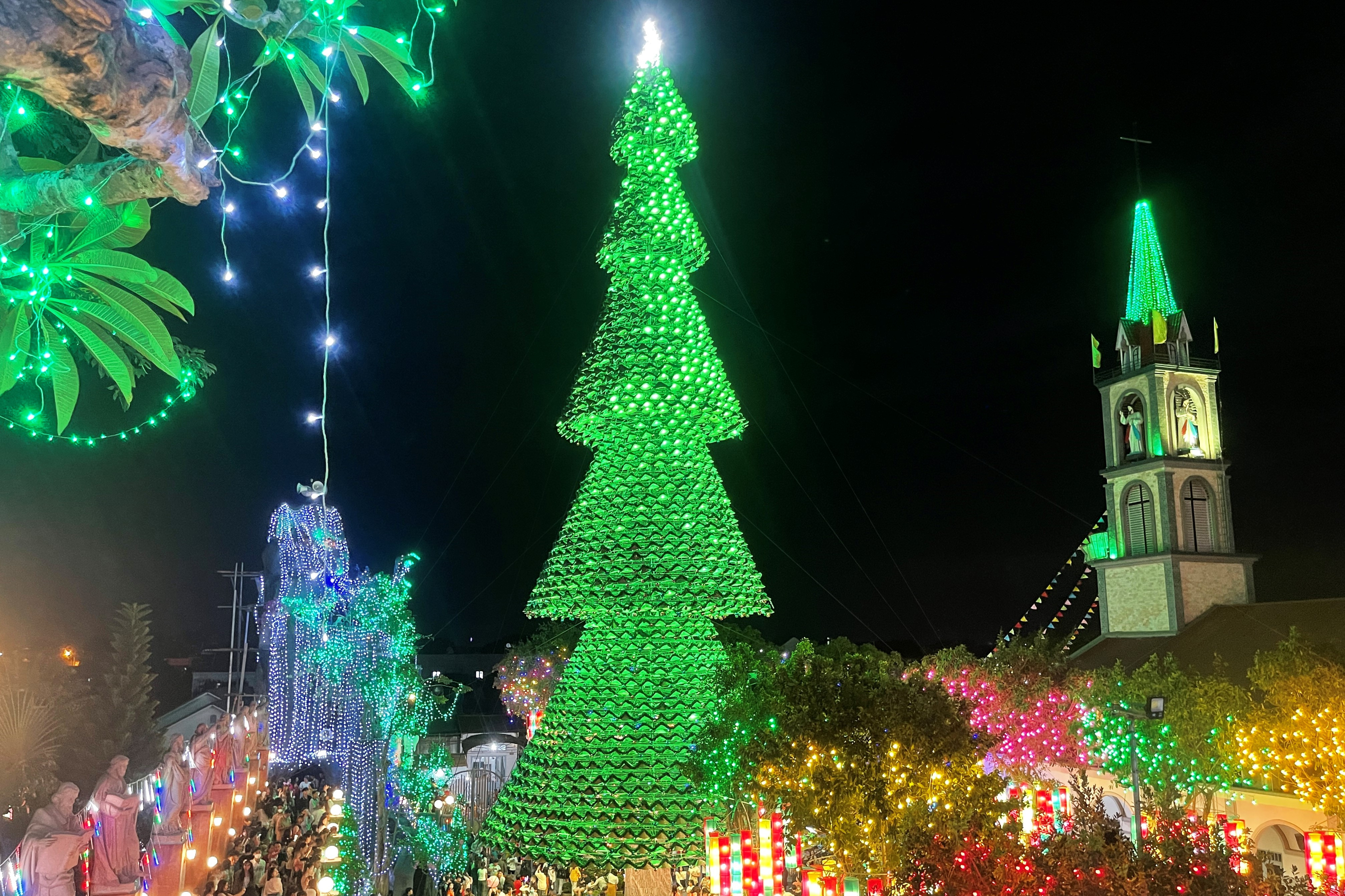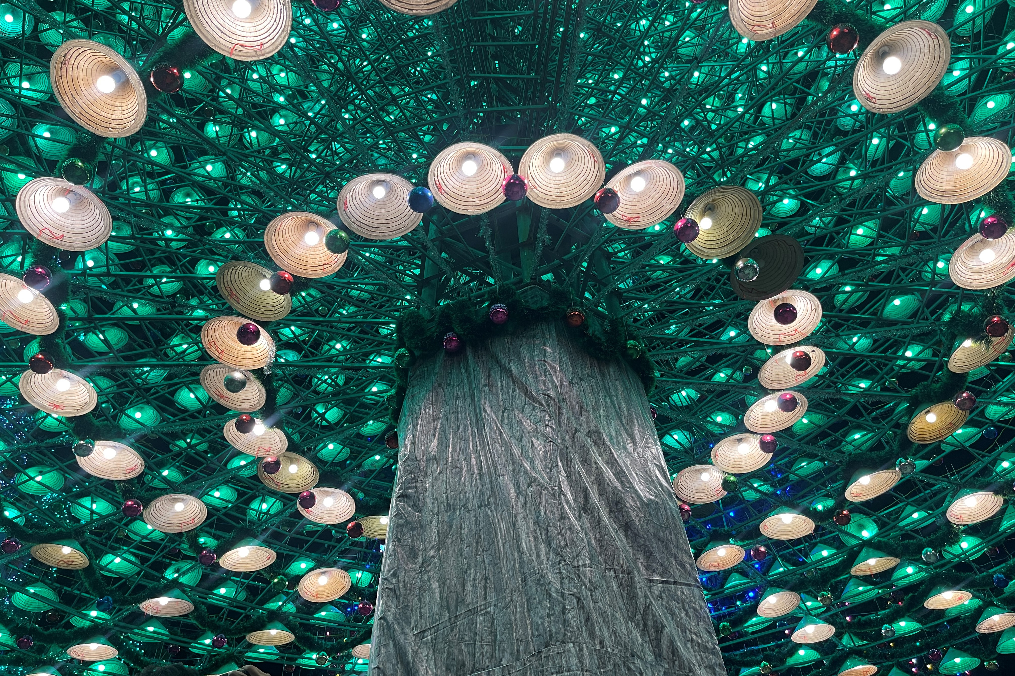 Nổi bật trong khuôn viên là cây thông cao 37m, được làm từ 2.500 chiếc nón lá. Hàng nghìn nón lá xếp theo từng tầng đều đặn theo hàng lối, mỗi chiếc nón đều có gắn đèn, quấn dây kim tuyến và quả châu xung quanh.