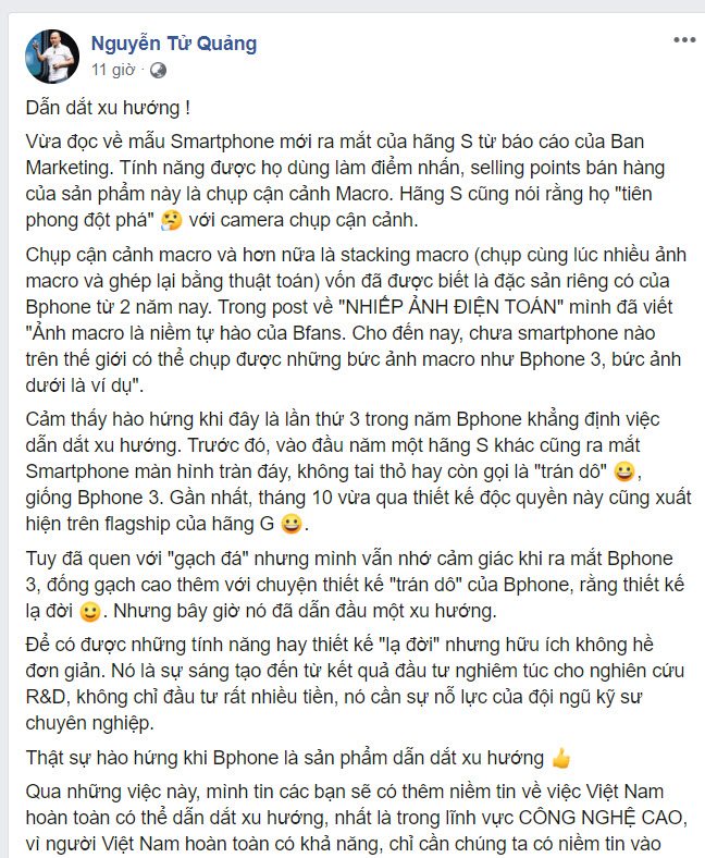 Bên cạnh đó, ông Quảng cũng viết rằng đang cảm thấy hào hứng khi đây là lần thứ 3 trong năm Bphone khẳng định việc dẫn dắt xu hướng. Trước đó, vào đầu năm một hãng S khác cũng ra mắt smartphone màn hình tràn đáy, không tai thỏ hay còn gọi là "trán dô", giống Bphone 3 hay gần nhất, tháng 10 vừa qua thiết kế độc quyền này cũng xuất hiện trên flagship của hãng G. “Tuy đã quen với "gạch đá" nhưng mình vẫn nhớ cảm giác khi ra mắt Bphone 3, đống gạch cao thêm với chuyện thiết kế "trán dô" của Bphone, rằng thiết kế lạ đời. Nhưng bây giờ nó đã dẫn đầu một xu hướng”, ông Quảng chia sẻ trong bài viết của mình trên Facebook.
