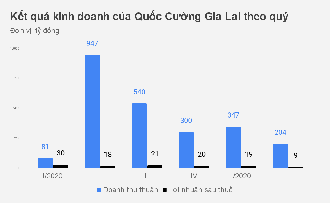 6 tháng đầu năm, Quốc Cường Gia Lai đạt doanh thu thuần 550 tỷ đồng, giảm gần phân nửa so với cùng kỳ 2020. Lợi nhuận sau thuế đạt 28 tỷ đồng, giảm hơn 30%.